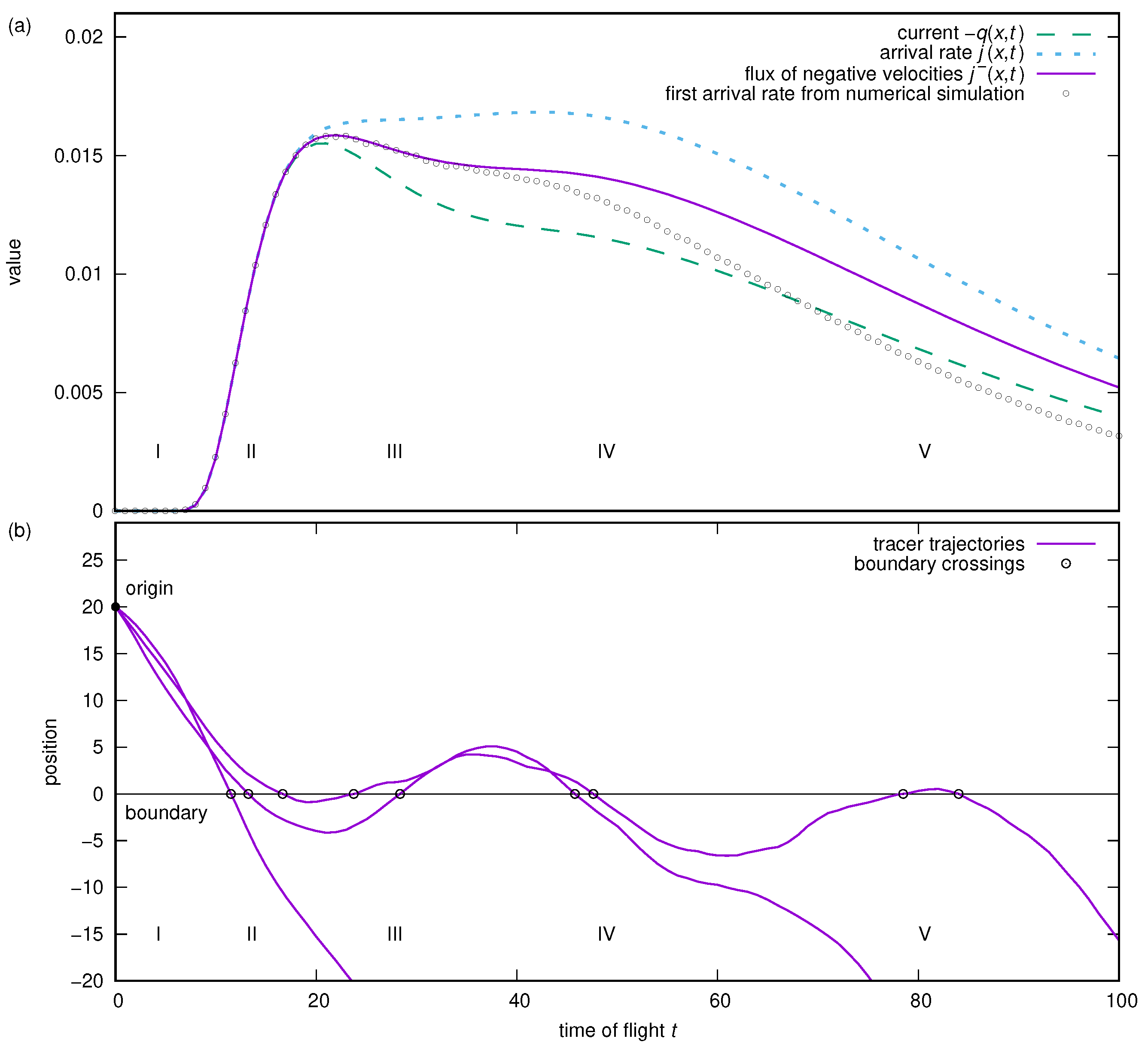 - Then (interval III) tracers return to the boundary with positive velocities. Here, the current and the arrival rate start to deviate because of their opposite sign when counting arrivals with positive velocities. If only negative velocities are considered with , the second arrivals are not counted, and this flux still follows the distribution of first arrivals from the simulated process.