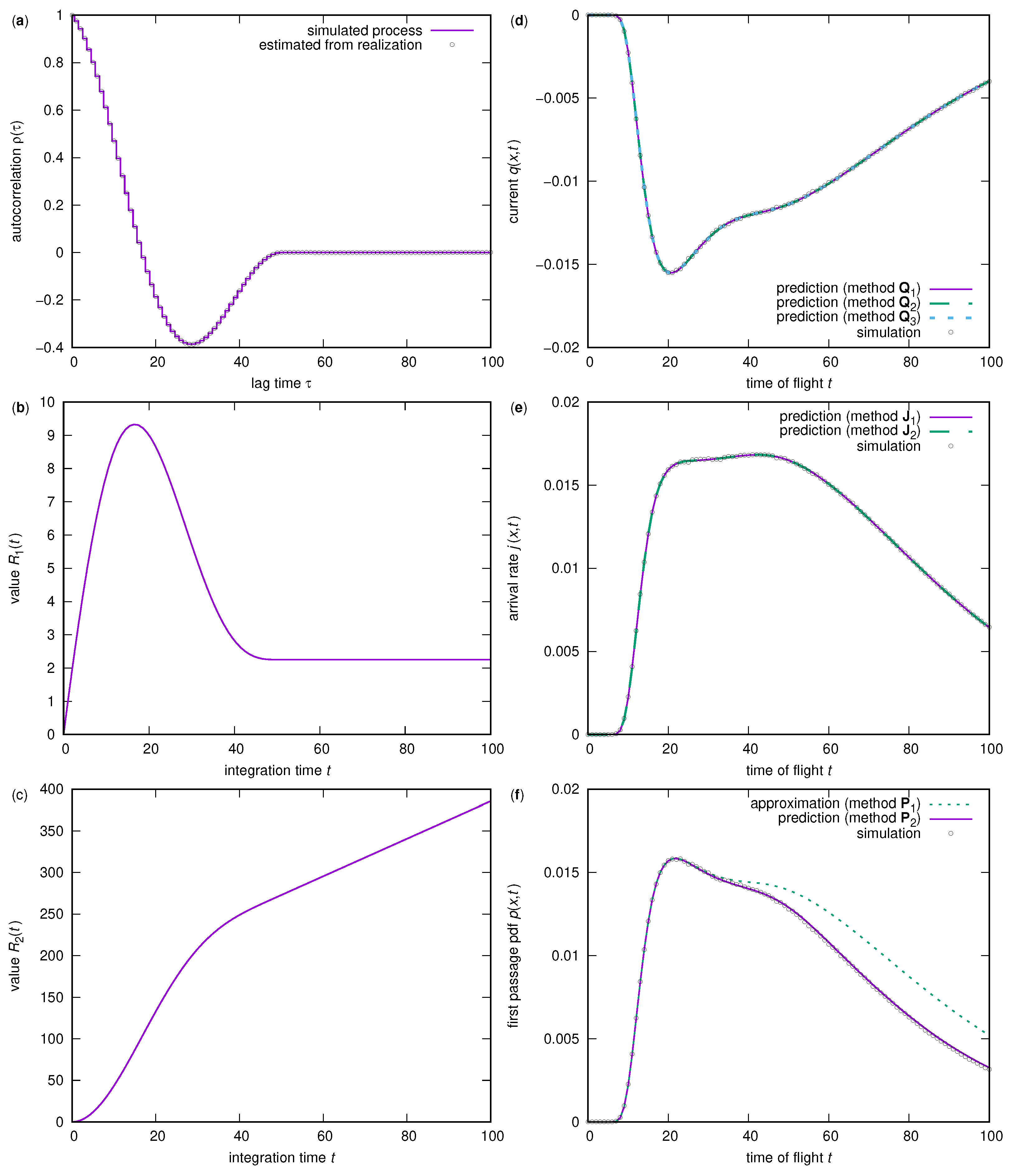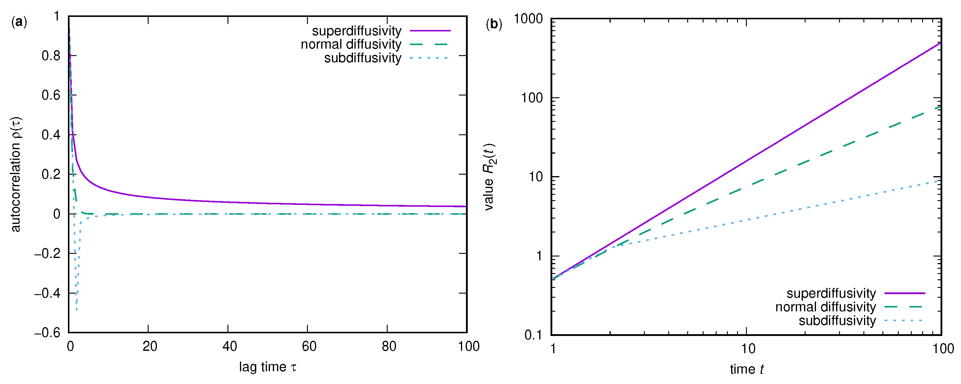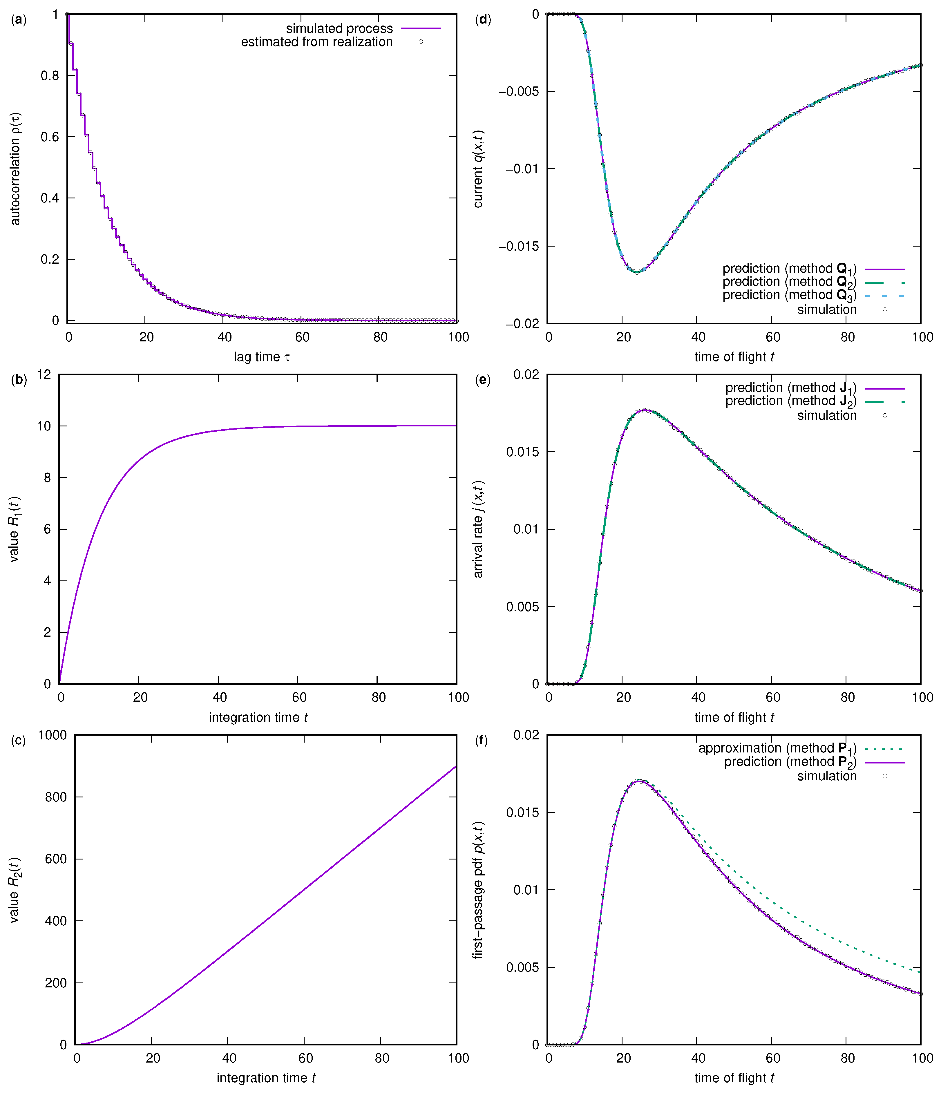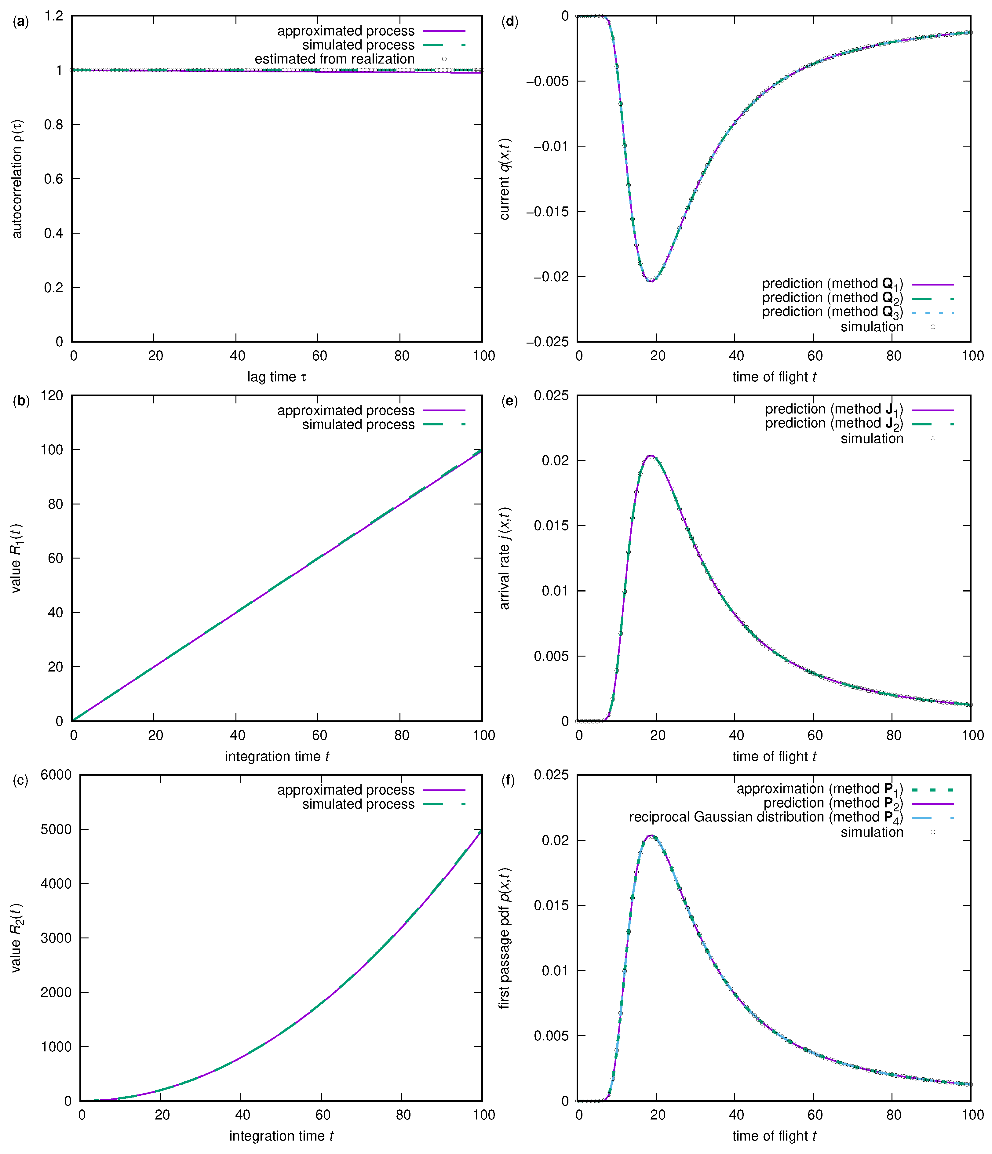 - is the probability density that a tracer has traveled the distance x within time t, conditioned on the arrival velocity u at the boundary at distance x to the origin of motion at time t. Then, is the probability that a fluid element is within the range at a given time t under the condition of having the arrival velocity u at the boundary at distance x at time t. Assuming a Gaussian distribution of velocities, this is given by (derivation in Appendix A.2)Both integrals and are characteristic of the diffusive behavior of the process. Therefore, these two integrals are shown for the various test processes in the following test section, together with the corresponding correlation functions.