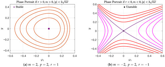 - Case C: When , i.e., when , the Hamiltonian system (13) possesses the three equilibrium points:To classify these equilibrium points, we apply Lagrange’s Theorem 1 and evaluate the second derivatives of the potential :Additionally, we determine the bifurcation parameter at these points:which plays a key role in characterizing the phase portrait. According to the sign of the product , we now consider the following two cases: