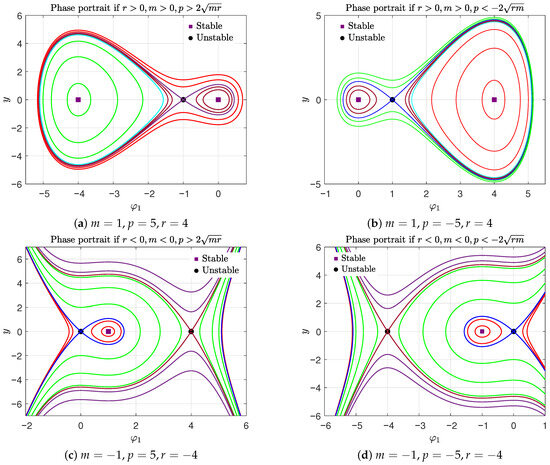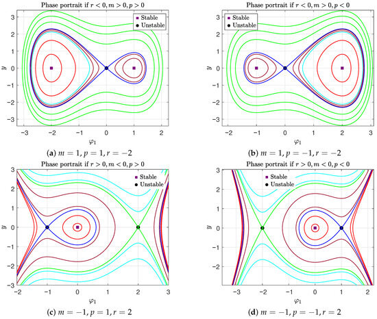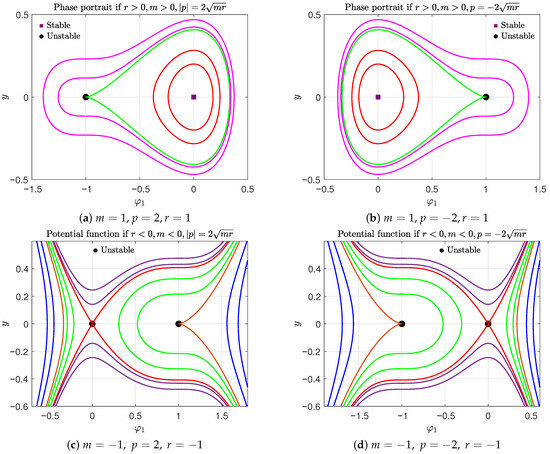 To examine the phase portrait of the dynamical system (13), we begin by identifying the equilibria of system (13) by calculating the critical points of the potential function (17). Specifically, these equilibria take the form , where is a solution to