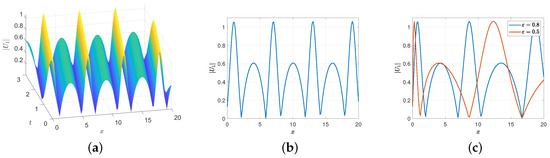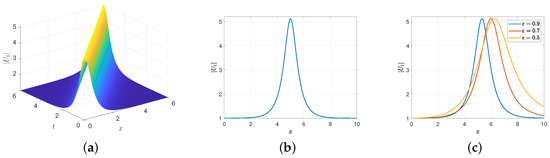 Figure 6 depicts the waveform of solution (53) for various values of the fractional order and . In Figure 6a, where both and were set to 1, the standard soliton profile is observed. Figure 6b represents the surface projection onto the plane , assuming . In Figure 6c, as deviates from 1, the pulse width broadens and the waveform gradually loses its symmetric shape.