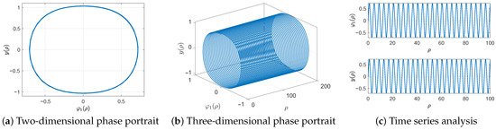 Two-dimensional and three-dimensional phase portraits with the time series graphs for system (13) with the condition , periodic force amplitude , and parameters from (57).