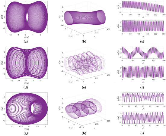 In the first case study, we fix the parameters m, p, and r at constant values and set the periodic forcing amplitude to . The external force frequency is varied systematically as the primary control parameter. All simulations use the same initial conditions: and . Figure 8 presents the dynamics of the perturbed system (55) under an external force amplitude of for frequencies , and . For , the 3D and 2D phase planes, shown in Figure 8a,b, display quasi-periodic wave patterns, further supported by the time evolution of and y in Figure 8c. When we increase the frequency up to , the behavior of quasi-periodic persists, as illustrated in Figure 8d–f. Notably, even at the higher frequency , the system remains non-chaotic. The phase portraits, together with time series graphs, are presented in Figure 8g–i.