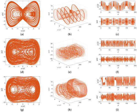 The physical parameter selected in (57) fixes p as before, with and . When , the perturbed system (55) maintains quasi-periodic dynamics, as demonstrated by the phase planes and time series graphs in Figure 9a–c. Raising the force frequency to induces a shift toward chaotic dynamics, as seen in Figure 9d–f. The chaotic effects intensify at , as depicted in Figure 9g–i.