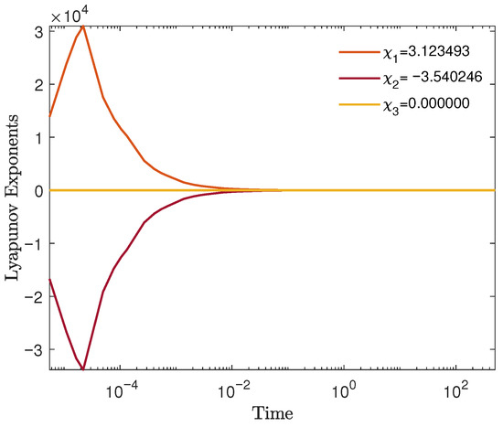 We proceed to evaluate the Lyapunov exponents of the perturbed system (55), applying the same values as in Figure 9g–i. These exponents, obtained through numerical simulation, are a powerful tool for investigating the stability and chaotic nature of complex dynamical systems. However, interpreting the results accurately requires a deep understanding of the internal dynamics of the system, since Lyapunov exponents are highly sensitive to specific characteristics of the system [41]. A positive exponent indicates chaotic behavior, whereas a negative one reflects convergence or stability. Thus, the computation of these values is crucial. The Lyapunov exponents of the perturbed system are given by: