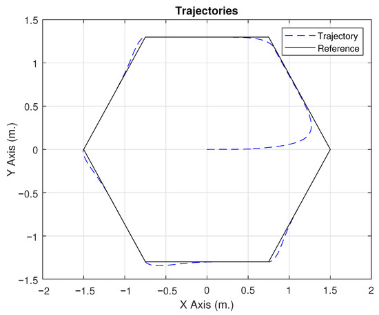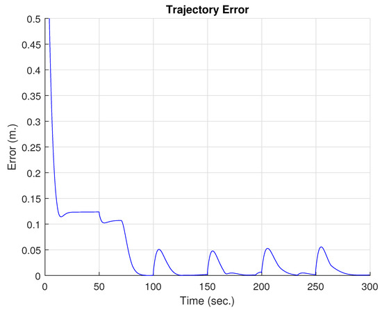 For the simulation experiment, WMR was considered for trajectory tracking. In this case, a hexagonal reference trajectory is established. To demonstrate the tracking capability with minimal error using the adaptive capacity of FLNNs, the dynamic parameters were altered by adding additional weight to the vehicle. This not only increases the mass, but also changes the center of gravity and increases friction due to deformation of the wheels. In the first few seconds, the robot operates with control without adaptive capability, where it can be observed in Figure 3 that the trajectory error is greater, including a peak in the first few seconds due to the WMR starting its trajectory away from the reference. Another point is Figure 4, where the upper subfigure indicates the position of the WMR on the x-axis, while the lower subfigure indicates the position of the WMR on the y-axis. After 75 s, the adaptive capability of the FLNN is activated, establishing a transient error that affects the trajectory. Seconds later, it can be observed that the error is considerably reduced, following the desired trajectory with greater fidelity than in the first few seconds. Figure 5 shows the vehicle’s speed control actions. The upper subfigure indicates the linear speed, where the vehicle follows the reference almost without any problems, except for the peak that occurs at 75 s due to the speed variation produced by the activation of the FLNN. The lower subfigure shows the angular velocity, revealing changes in velocity due to the small turns at each vertex of the trajectory. Finally, Figure 6 shows the mean square error produced by the proposed control technique, confirming the decrease in trajectory error after 75 s. In the experiment, it is easy to observe the reduction in trajectory error due to the activation of the neural network, which has the primary function of providing an adaptive characteristic to the proposed controller. Therefore, it adjusts the parameters of the FLNN neural network in the presence of dynamic uncertainties or external disturbances (the difference in error before and after 75 s shown in Figure 6).