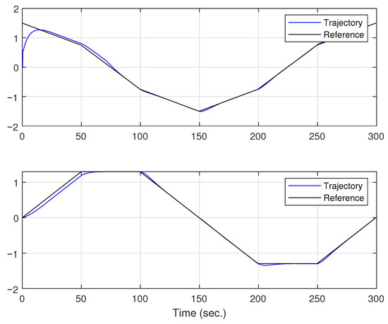 The upper subfigure indicates the position of the WMR on the x-axis, while the lower subfigure indicates the position of the WMR on the y-axis.