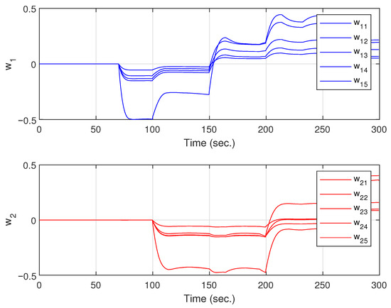 The last figure, Figure 7, shows the evolution of the weights of the FLNN output layer . Where each subfigure shows the weights associated with each control action , it can be seen that the weights are bounded.