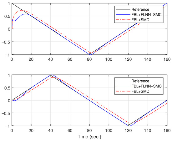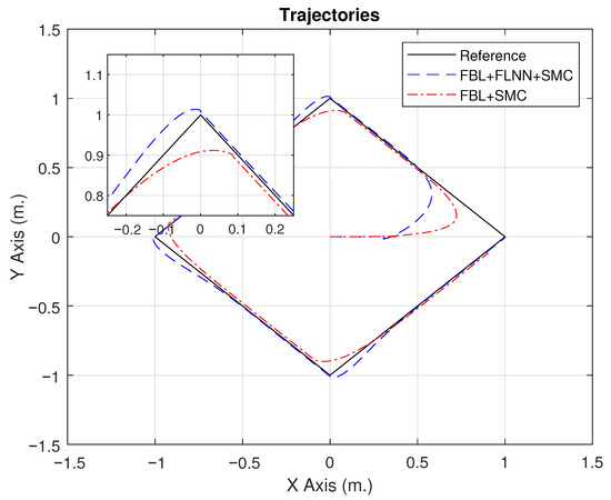 In the second experiment, a comparison is made between the proposed technique (feedback linearization (FLB) + SMC + FLNN) and the proposal without adaptive capacity (feedback linearization + SMC). Figure 8 shows the position of the WMR on the x- and y-axes. It can be seen that the proposed technique has a better response to trajectory tracking; in fact, it is easy to see that in both subfigures, the controller follows the desired trajectory more closely. It can also be seen in Figure 8 that the proposed controller has a better response to discontinuous trajectories (corners), attempting to reduce trajectory error more effectively.