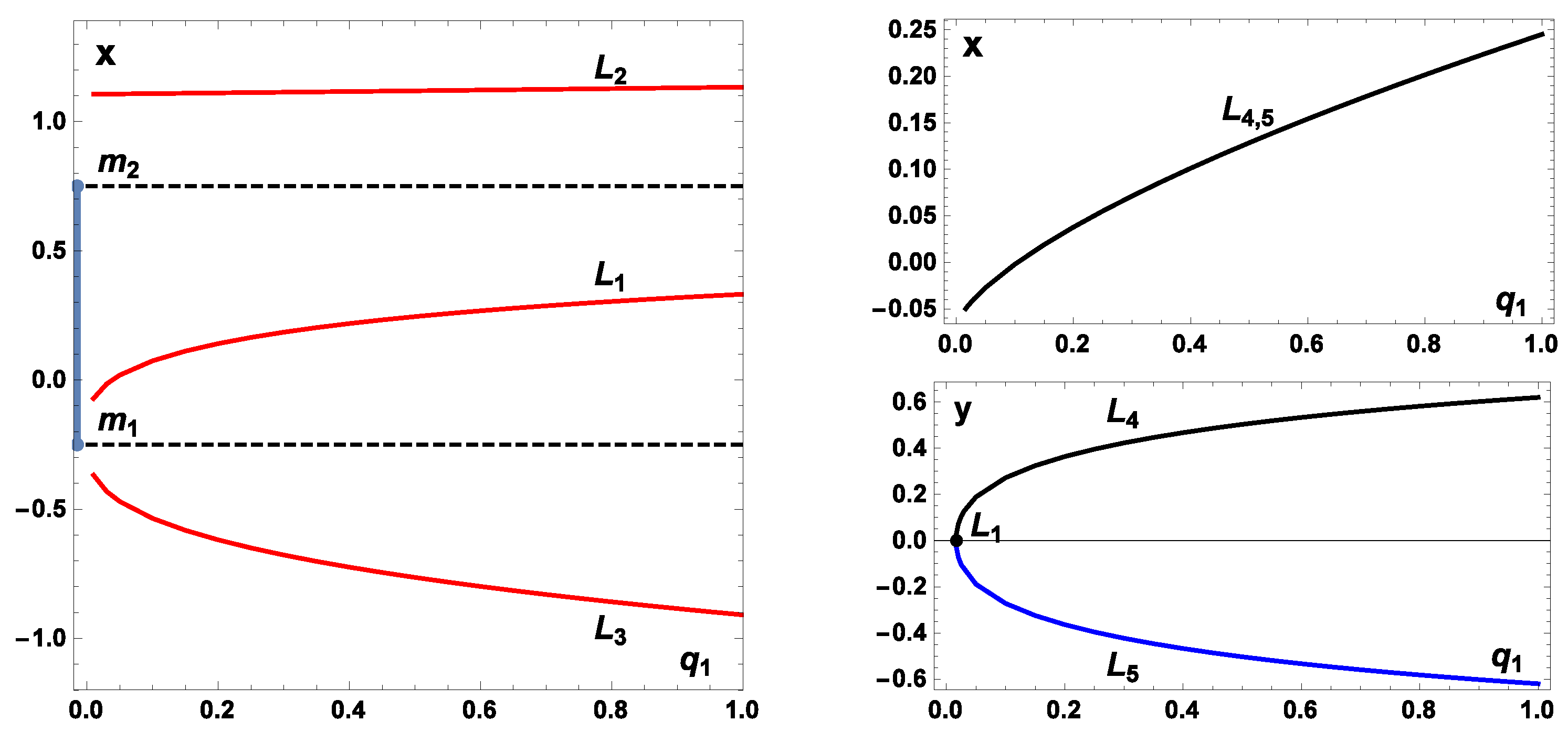 Figure 2 (left panel), we illustrate the location of the collinear EPs as the radiation pressure increases (Case 3), keeping the remaining parameters equal to