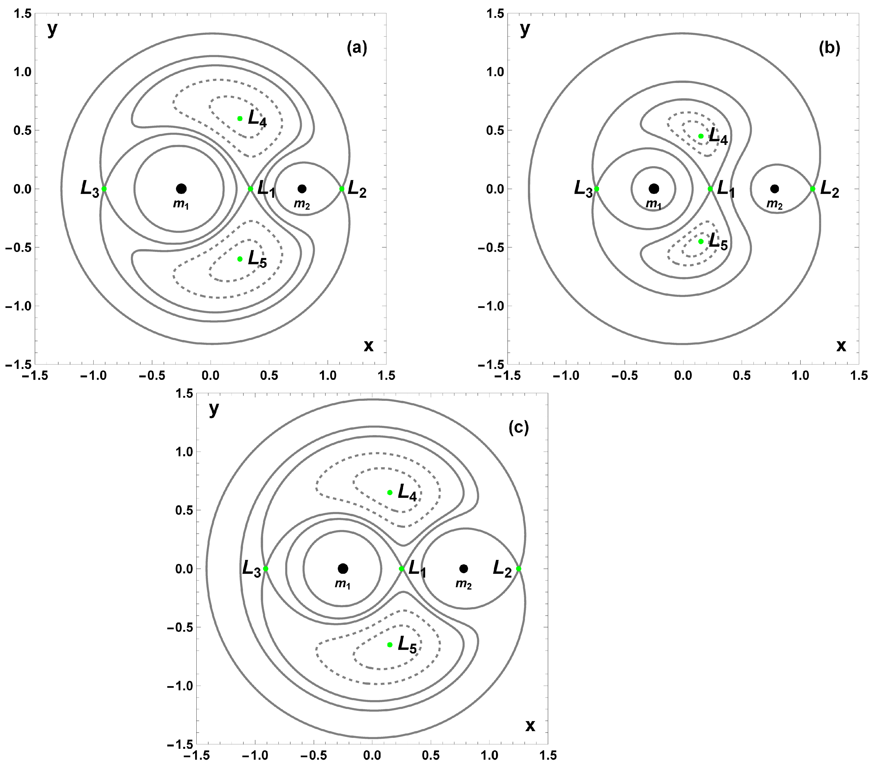 Table 1 that each parameter under consideration significantly influences the location of the EPs. In the unperturbed classical configuration (Case 1), the EPs retain their classical coordinates, consistent with the results in [