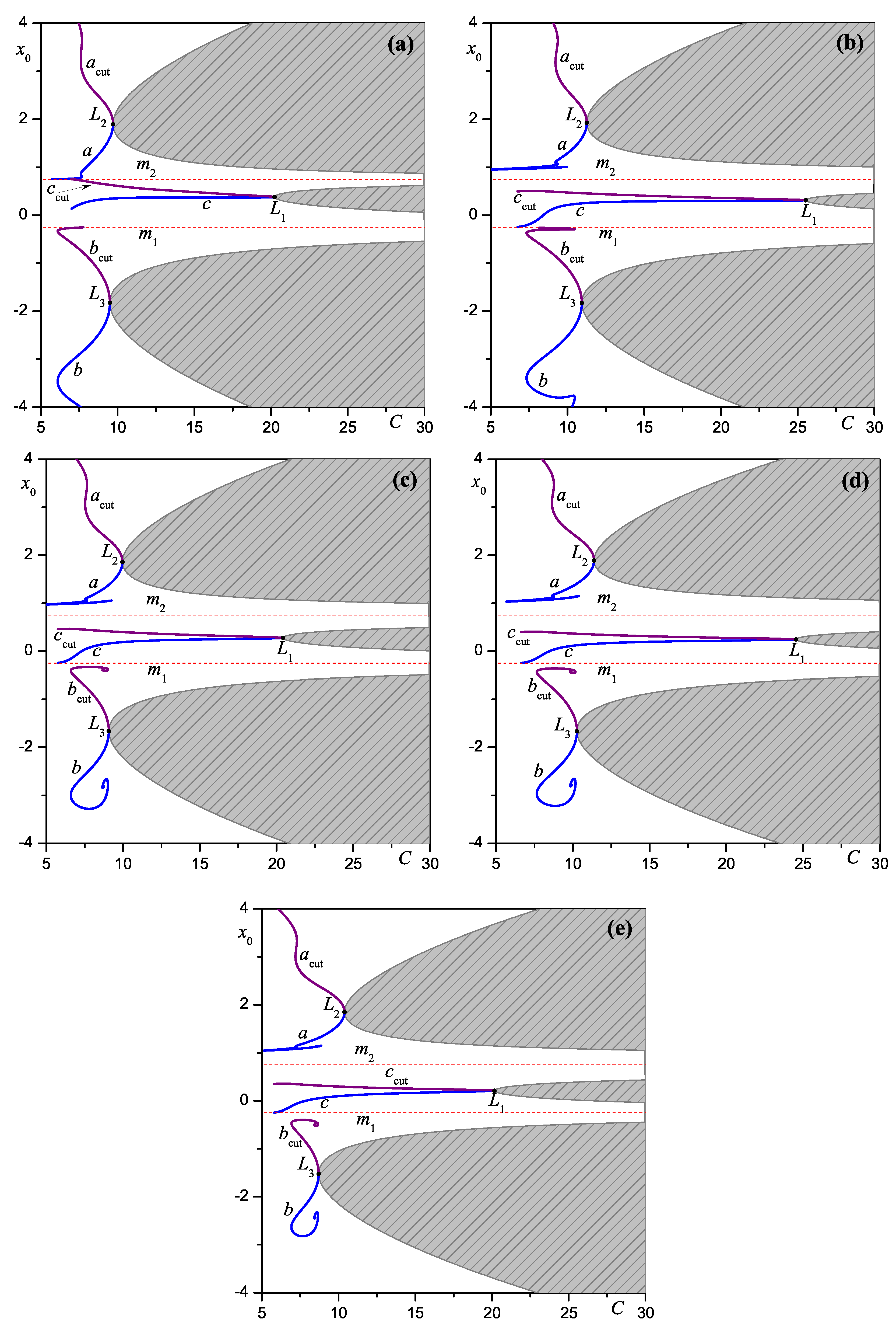 -plane for zero kinetic energy. These contours define the ZVCs which enclose regions where the motion of the infinitesimal body is energetically allowed or forbidden. The structure of these regions is essential for understanding the particle’s dynamical behavior under various perturbing influences and it significantly differs from that of the classical RTBP. In particular, the presence of the force ratio