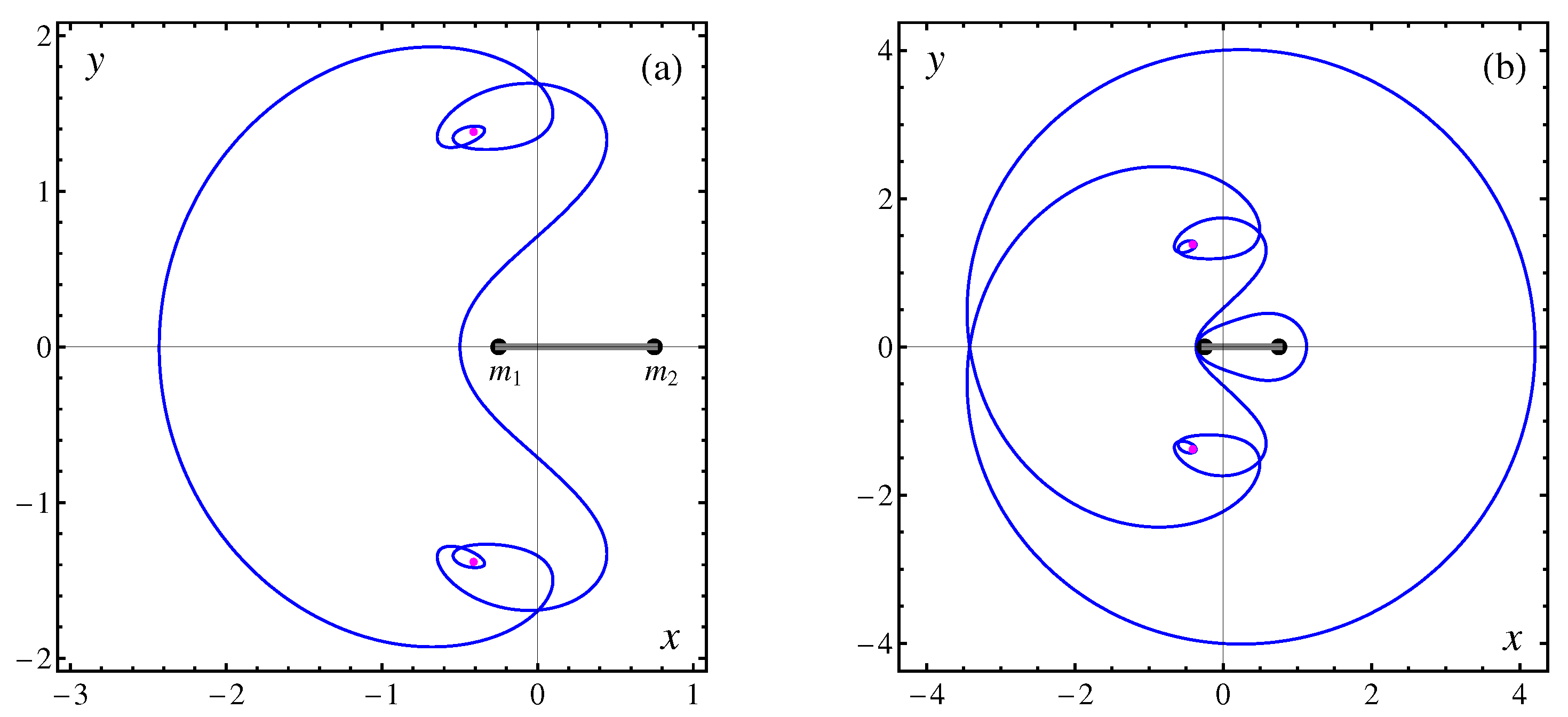 moves under their gravitational influence without perturbing their motion. The system is rendered dimensionless by selecting the total mass