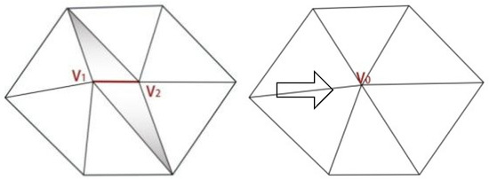 During the simplification process of the triangular mesh model, the edge collapse operation usually merges a pair of vertices into a new vertex and reconnects the relevant triangular faces. This process removes two to three triangles and alters the geometry of several adjacent triangular faces, as shown in Figure 1. To retain the details of the original mesh as much as possible, the simplification algorithm needs to determine which edge collapse operations cause the least error and prioritize collapsing these edges. In other words, the key issues lie in two aspects: (1) how to measure the error, that is, how to define the optimal pair of collapse vertices; and (2) how to determine the position of the new vertex after collapse in order to minimize the error.