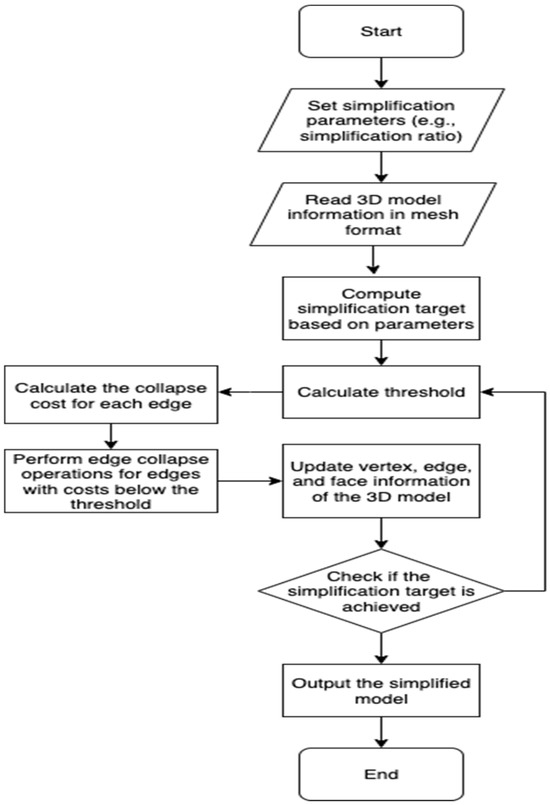 Figure 2 illustrates the overall workflow of the QEM simplification algorithm. The process begins with setting simplification parameters such as the target ratio, followed by loading the 3D model in mesh format. Based on the parameters, the target number of faces is computed, and a threshold is established for edge collapse operations. Each edge is then assigned a collapse cost, and those with costs below the threshold are iteratively removed through edge collapse operations. After each collapse, the vertex, edge, and face information of the mesh is updated to ensure geometric consistency. The algorithm continues until the simplification target is reached, after which the final simplified model is output. This flow chart provides a clear procedural overview that complements the mathematical formulations introduced earlier, highlighting the iterative nature of QEM-based mesh simplification. The basic calculation flow chart of the QEM algorithm is as follows: