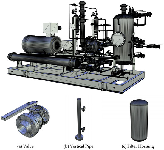 Pipeline model used in experiments with internal parts (a–c) https://sketchfab.com/3d-models/industrial-units--9-17-026a1fd299ec4e4583422b362c2e7e81 (accessed on 5 September 2025).