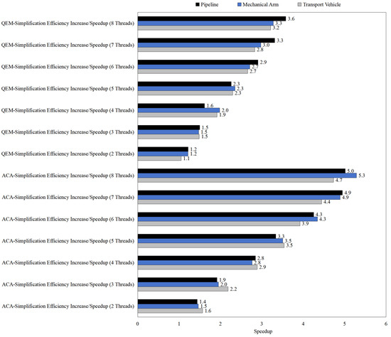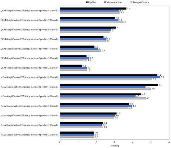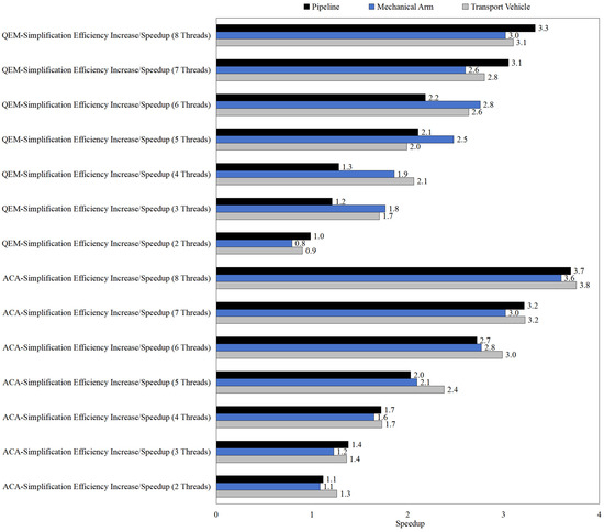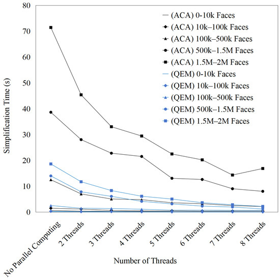 The results presented in Figure 9, Figure 10 and Figure 11 reveal the impact of multi-thread parallelization on the computational efficiency of both QEM- and ACA-based simplification algorithms under different simplification ratios. Overall, the speedup achieved by parallel computing exhibits a consistent increasing trend with higher thread counts, although the magnitude of improvement strongly depends on the algorithm type, simplification ratio, and model category. Specifically, ACA shows more substantial parallel acceleration than QEM across all tested scenarios, which can be attributed to its higher computational complexity and larger per-thread workload, making it more suitable for parallel exploitation. In contrast, QEM demonstrates only modest speedup gains, especially under lower simplification ratios, where the computational burden is relatively small and parallel overhead offsets much of the benefit (Table 2, Table 3 and Table 4).