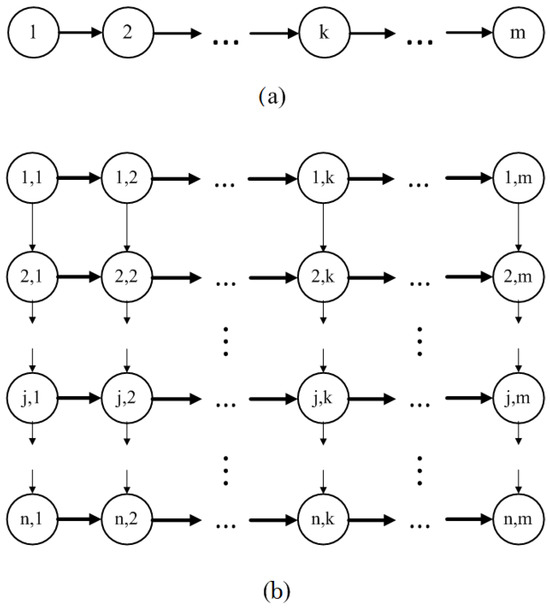 The precedence graph of such a problem (see Figure 1a) is a simple chain in which the vertices are machines, and the edges define precedence relations between the machines. This graph can be “expanded” if we fix some order of the jobs and define precedence relations between the jobs and between the machines . Any vertex of such a graph is identified with the pair (job number, machine number). An expanded graph describing precedence relations between the jobs is presented in Figure 1b.