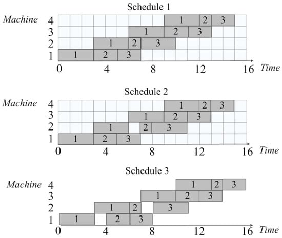 There exist a huge number of publications devoted to the permutation flow shop problem (PFSP) or to the more general case of the flow shop problem (FSP) in the scheduling literature. In both the PFSP and the FSP, all jobs must be processed on a set of m machines according to a fixed technological order. In the PFSP, all jobs are performed by each machine in the same order, while in the FSP, jobs may be performed in different orders on different machines selected to satisfy a specific optimization criterion. Often, the makespan has to be minimized, i.e., the maximum completion time of the complete set of jobs should be minimized. The PFSP is denoted as . In [1], an overview of the PFSP with the makespan criterion is presented. Three categories of methods used to solve the PFSP are considered: traditional algorithms, heuristic algorithms, and meta-heuristic algorithms. This study focused on meta-heuristic algorithms due to their effectiveness in solving many application problems. As a result of this study, it was demonstrated that meta-heuristic algorithms play a vital role in solving the PFSP. Most works deal with various heuristics and metaheuristics, see, e.g., [2,3,4,5,6]. Much of the current work in the field of the PFSP is related to Industry 4.0 [7,8]. References [9,10] provide an overview of the FSP with assembly operations (AFSP). The basic assembly process in a workshop is described, consisting of two stages: the manufacturing or machining stage and the assembly stage. The machining and assembly stages use one or more machines operating in parallel. The final products have a hierarchical assembly structure with multiple components and assembly operations. A review of assembly shop models with a methodology for solving the corresponding problems of scheduling theory is presented. No less intensive work has been done for the job shop problem (JSP). We briefly discuss some of the latest publications. A review of more than 120 papers has been presented in [11]. It examines the problem in relation to the new demands of Industry 4.0. This line of research has split into several new independent ones. Another review [12] briefly described the research developments and current state of the art of job shop problems, classifying existing research methods and discussing future directions for the development. Reference [13] described the development of an innovative high-performance genetic algorithm for the JSP. In [14], a genetic algorithm and a simulated annealing one have been proposed for application in the manufacturing industry. Finally, reference [15] provided an overview for a generalization of the classical job shop problem, namely the flexible job shop problem (FJSP).