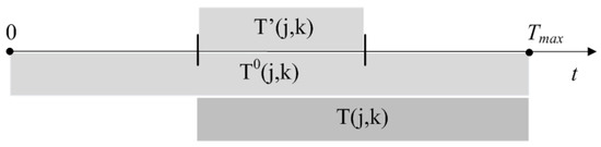 - the interval is to the left of . The completion time of the jth job on the kth machine should be artificially increased to values from the interval . Only in this case, the schedule will be feasible;