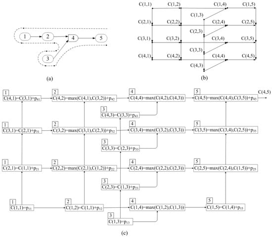 For a fixed sequence of jobs, the function is implemented by a precedence matrix predefined by the precedence graph. For example, the precedence matrix W for jobs j with respect to machines k and matrix P of the given operation processing times, corresponding to the graph in Figure 10a, will have the following form: