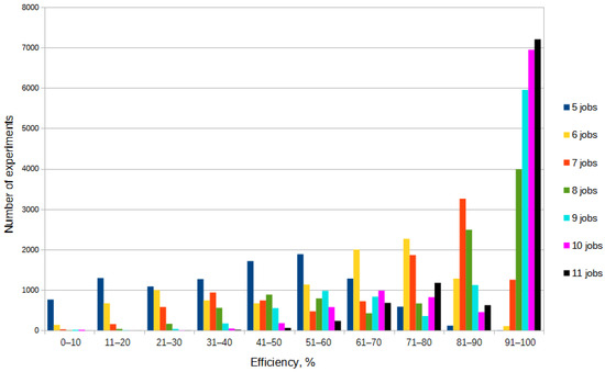All random values are uniformly distributed integers. For each number of jobs, a histogram of the distribution of the number of experiments in the ranges of the efficiency obtained in the experiment was constructed. Thus, seven histograms were constructed, presented in Figure 9.
