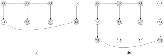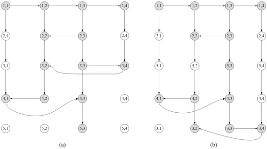 The job shop problem (JSP) is a generalization of the FSP. For each job, the JSP allows its own set of machines to be used from the set and its own order of execution of any job by the machines. The order of execution is determined by the precedence relationships between the machines, and it is possible that a job does not use the entire set of machines. In this section, we consider a special variant of the JSP, namely the permutation job shop problem (PJSP), where the job sequence is identical for all machines. Figure 10a shows an example of a job shop precedence graph for some fixed order of jobs. Just as in Figure 1, each job corresponds to a row of machines. If a job uses a machine, the corresponding graph vertex is shaded. The horizontal arcs represent the precedence relationships between the machines, and the vertical arcs represent the precedence relationships between the jobs for some fixed order of the jobs. We will call the pair (job number, machine number) relevant if machine k is used to perform job j, and we will call machine k relevant for job j and irrelevant otherwise. All machines that are irrelevant for job j are characterized by a zero processing time, i.e., . Example Figure 10a shows that for each job, the precedence relationships between the machines are defined only between the machines that are relevant for the given job. Figure 10b shows the graph that results from swapping the third and fifth jobs of the graph in Figure 10a. Obviously, when the jobs are rearranged, the precedence relationships between the machines for each job do not change, but they do change between the jobs. The precedence relations between the machines are defined by the precedence function as follows: