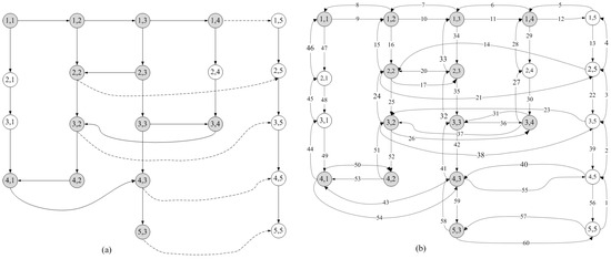 The result of the additions for the graph in Figure 10a is shown in Figure 14a. If we call the function , then, in the process of calculation, it will go through the machines and jobs in the order shown in Figure 14b using the numbered arrows. If arrows hit vertices where has already been evaluated, they are returned (the function is not re-evaluated). This corresponds to a memorized computation, which significantly reduces the overall amount of computation.