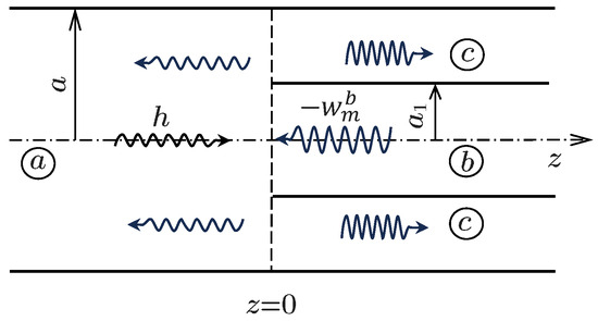 We let a TE-wave with a unit amplitude and a wave number h (see (1), Figure 3) impinge on the open end of a semi-infinite waveguide of radius , coaxially located inside an infinite circular waveguide of radius a, from the left.