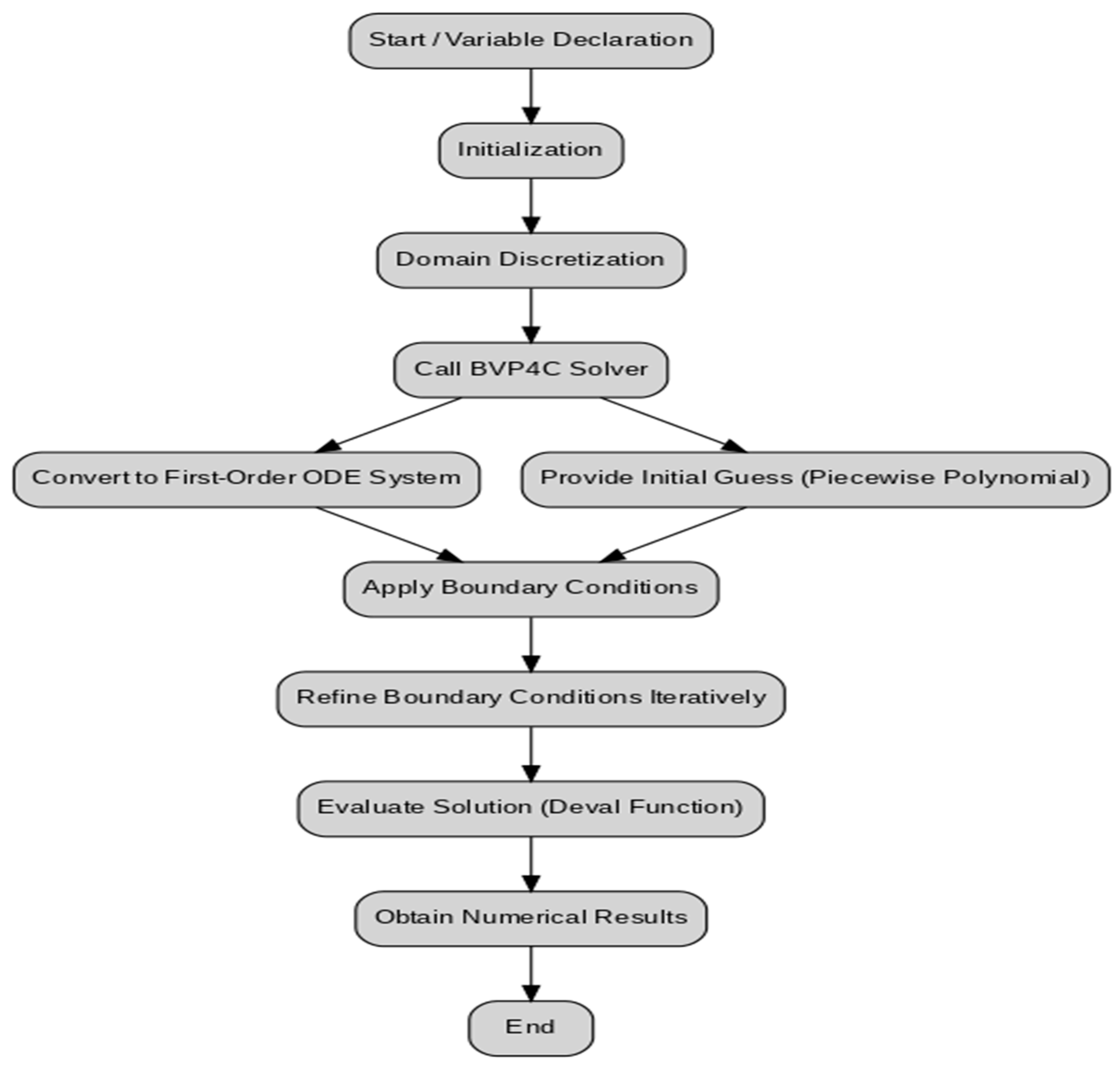 Figure 2 presents the computational flow chart, which outlines the step-by-step procedure adopted in formulating, transforming, and numerically solving the governing equations using the BVP4C method.