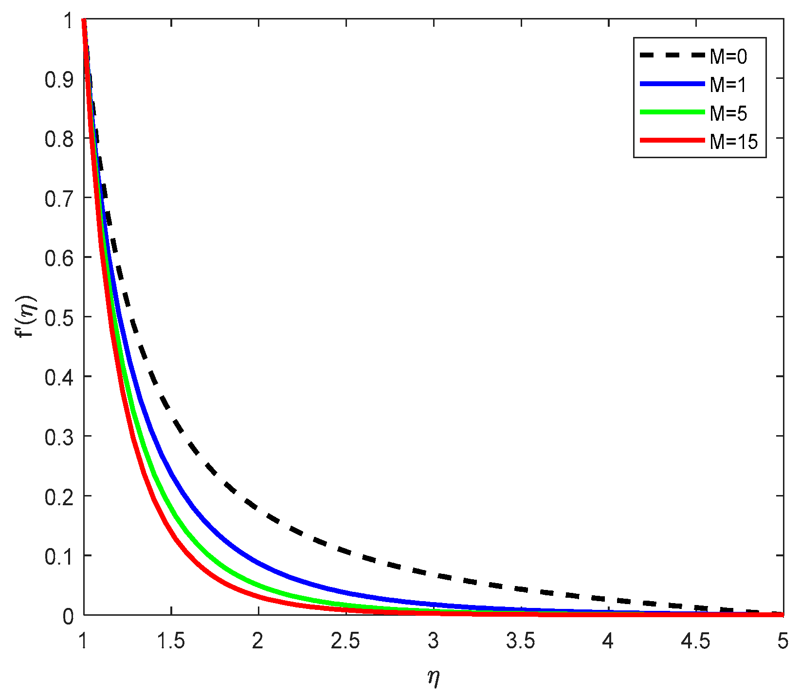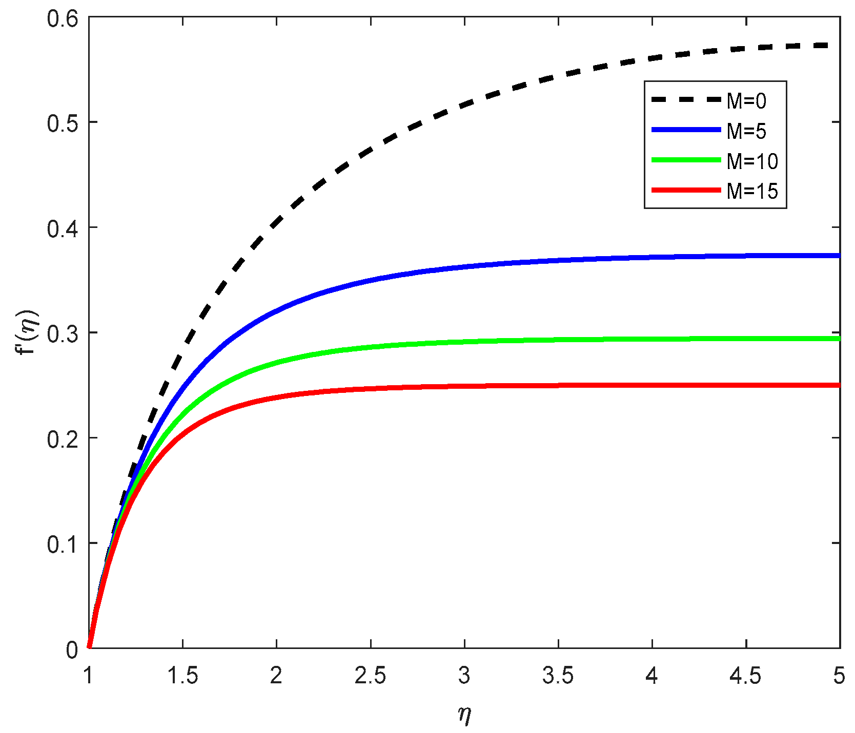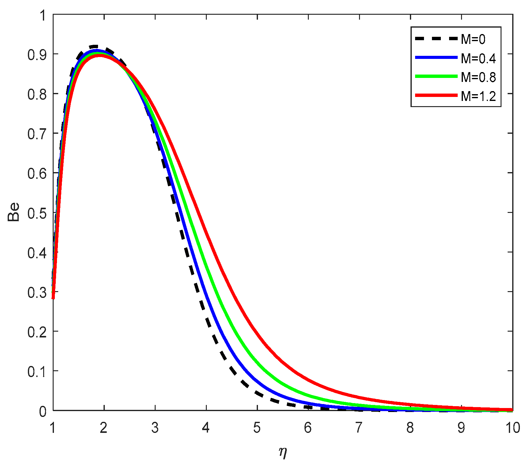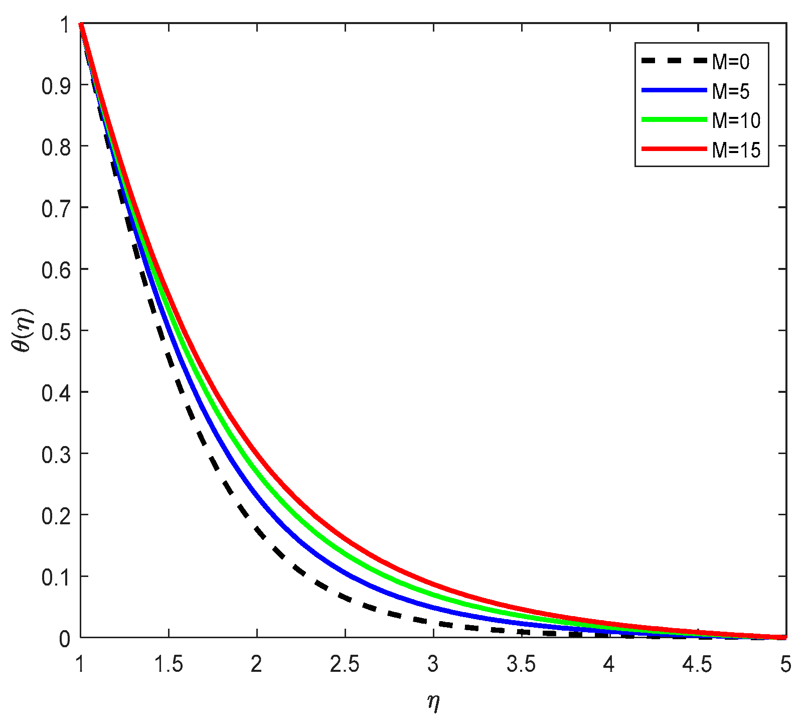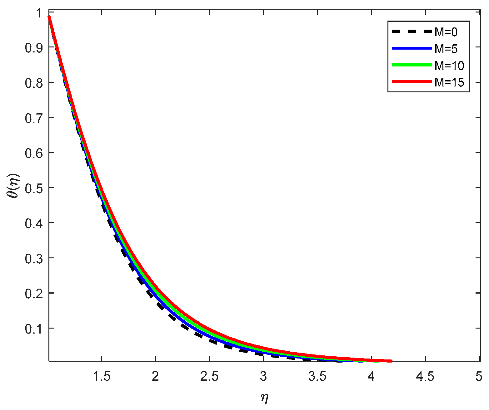 influences temperature variation when the magnetic field is inclined at ξ = π/6. The results demonstrate that temperature increases noticeably with increasing M. The inclined magnetic field intensifies the Lorentz force acting opposite to the flow direction, diminishing fluid velocity and weakening convective heat transfer. This effect is more pronounced at ξ = π/6, as the inclination introduces asymmetry in the flow and alters the thermal boundary layer development. The combined effect of magnetic resistance and angular influence leads to higher fluid temperatures, especially near the stretching surface.