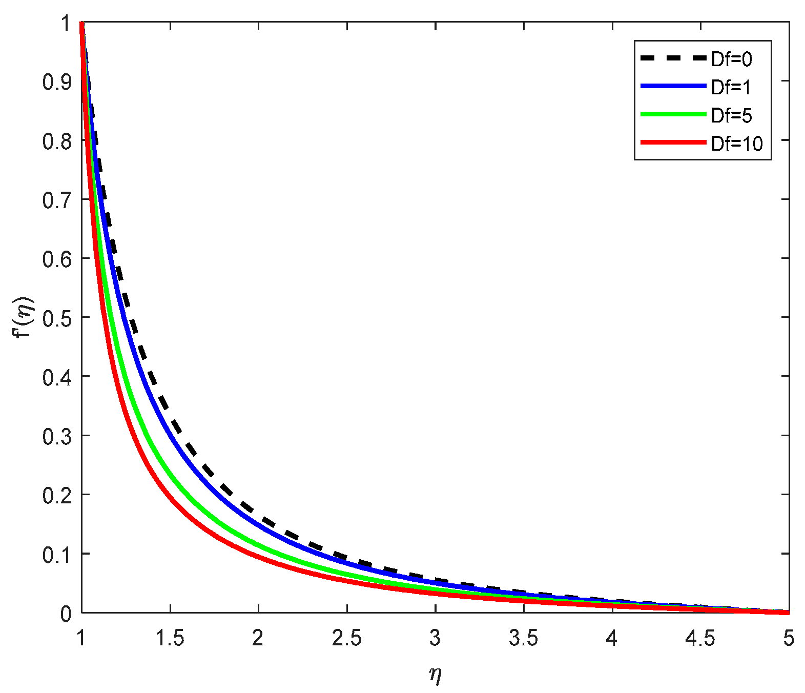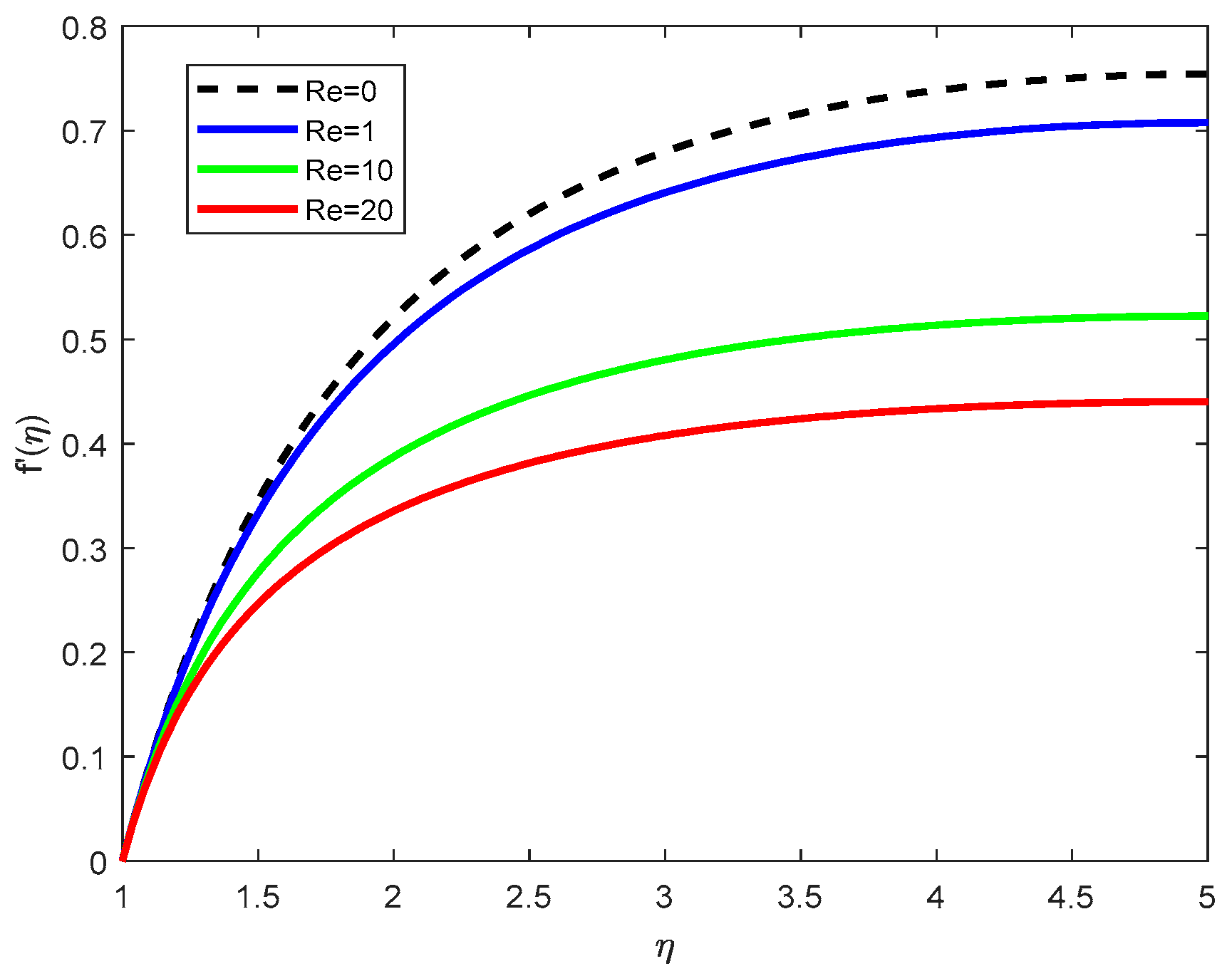 The velocity of the fluid decreases with increasing magnetic parameter due to the Lorentz force, which imparts a damping effect opposing the flow. Similarly, higher Darcy–Forchheimer parameter values—representing porous medium resistance—significantly suppress fluid motion, and increasing Reynolds number (Re) also leads to reduced near-wall velocities due to enhanced inertial resistance and boundary layer thinning.
