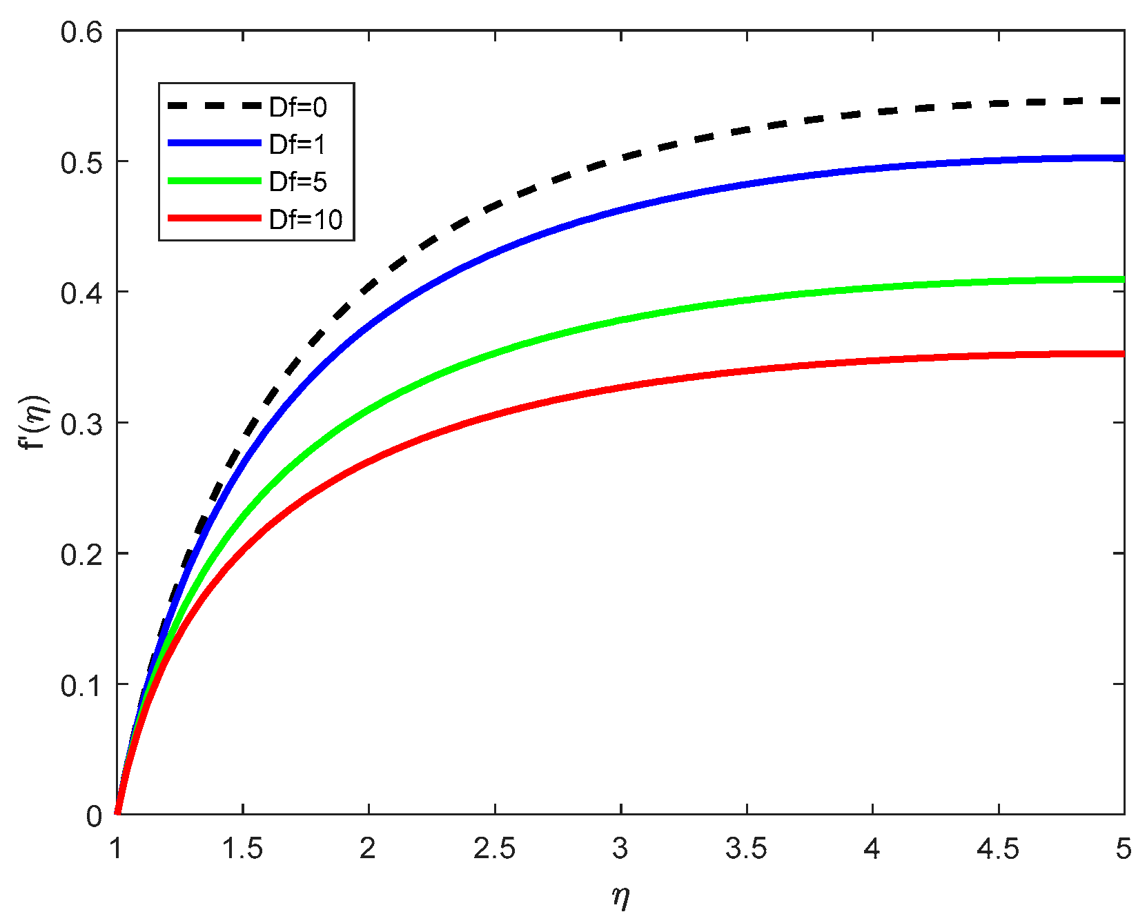 The Darcy–Forchheimer parameter , which accounts for resistance due to a porous medium, influences both the velocity and thermal fields. As increases, the magnitude of (0) becomes more negative, indicating stronger resistance to flow due to nonlinear drag. Simultaneously, the Nu decreases slightly, suggesting a mild reduction in heat transfer efficiency.