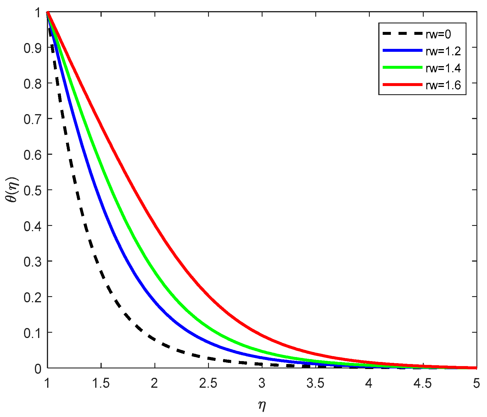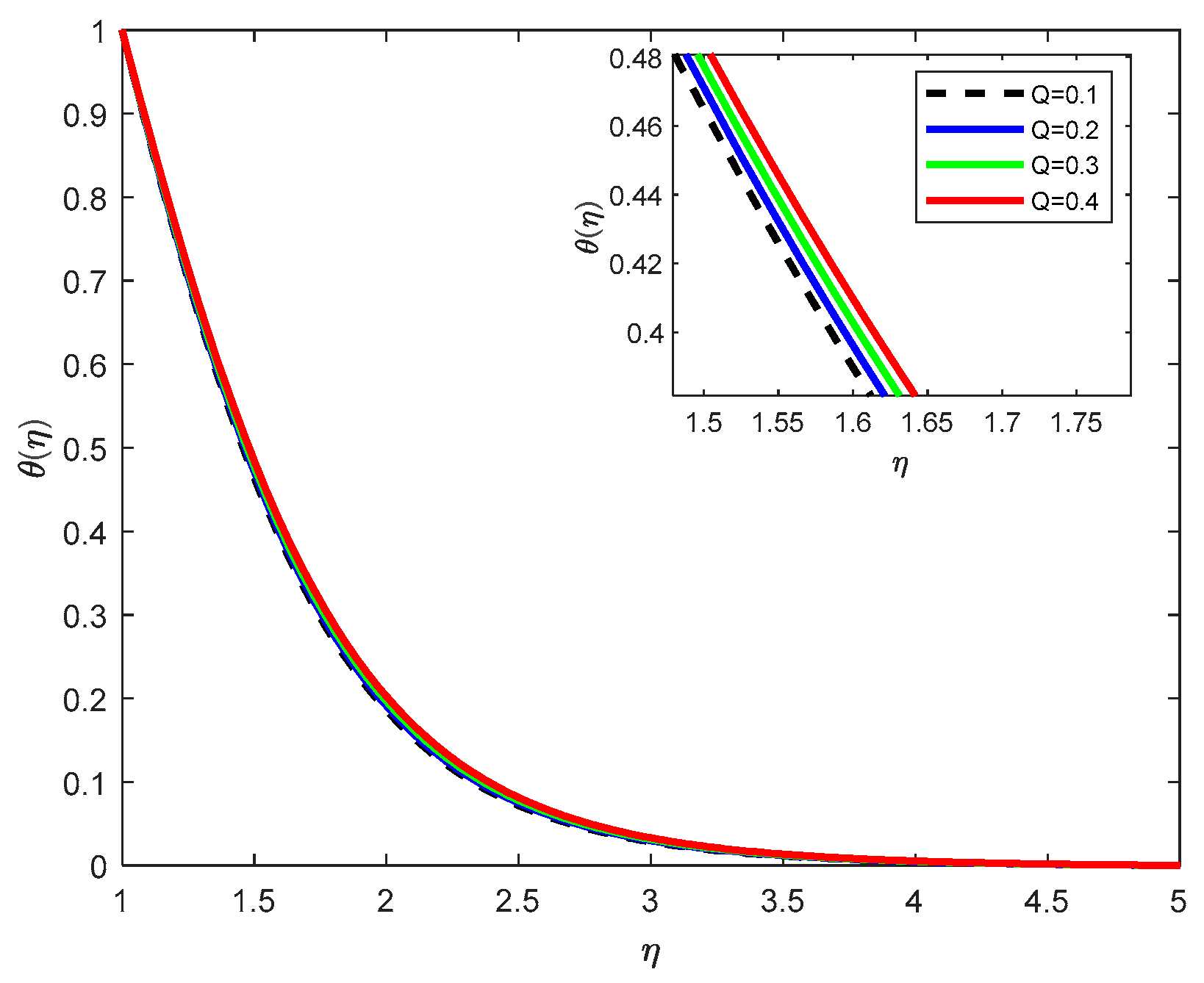 The thermal boundary layer thickens with increasing nonlinear radiation parameter heat source (Q), and wall-to-ambient temperature ratio . These parameters elevate the temperature by weakening convective cooling and enhancing thermal energy input or retention in the system.