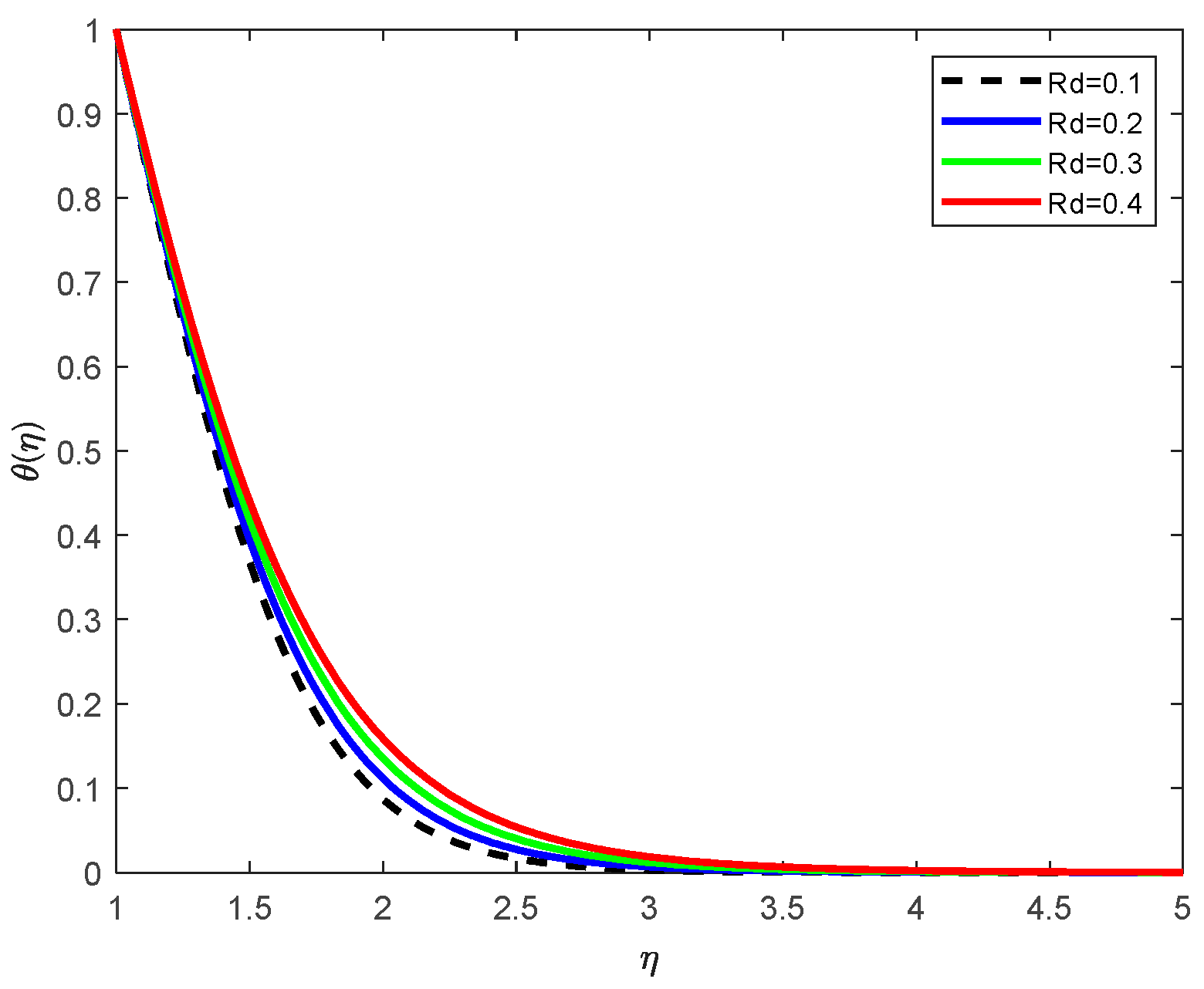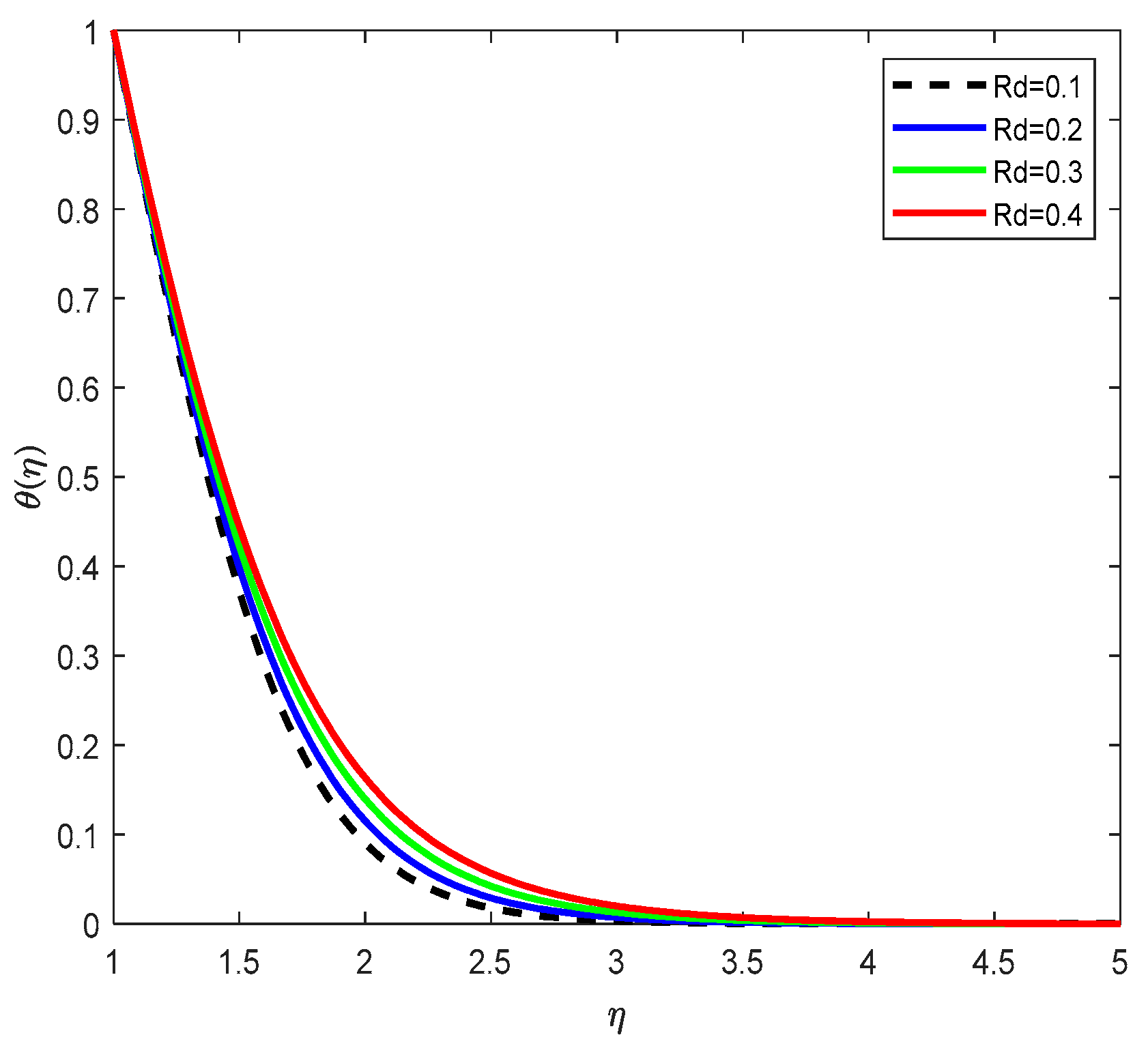 The nonlinear thermal radiation parameter also demonstrates a clear impact on the thermal field. As increases, the Nu decreases, showing that enhanced radiation leads to increased internal energy transport, which in turn reduces the effectiveness of convective heat transfer.