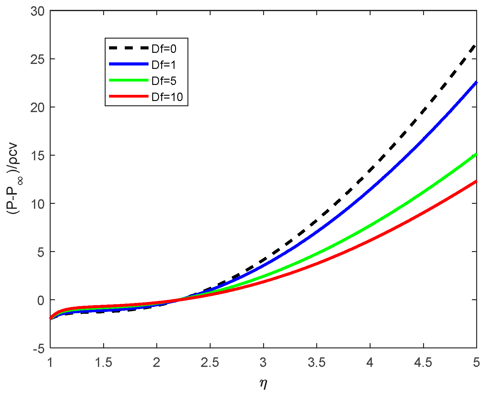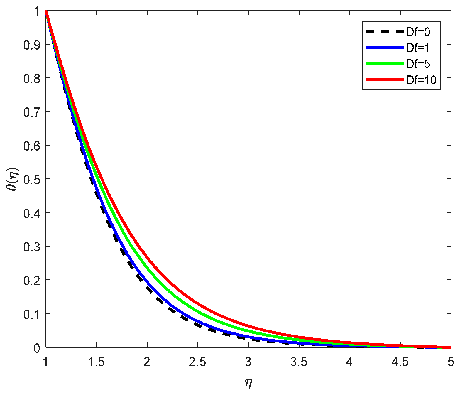 Figure 27 presents the coupled influence of the Darcy–Forchheimer parameter (Df) and wall-to-ambient temperature ratio (rw) on the Nusselt number (Nu). It is evident that superior heat transfer performance is obtained when both parameters are maintained at relatively low levels. Increasing Df intensifies the inertial resistance within the porous medium, thereby attenuating convective transport and leading to a decline in Nu. Likewise, larger rw values reduce the curvature-driven thinning of the thermal boundary layer, which further suppresses the surface heat transfer rate.