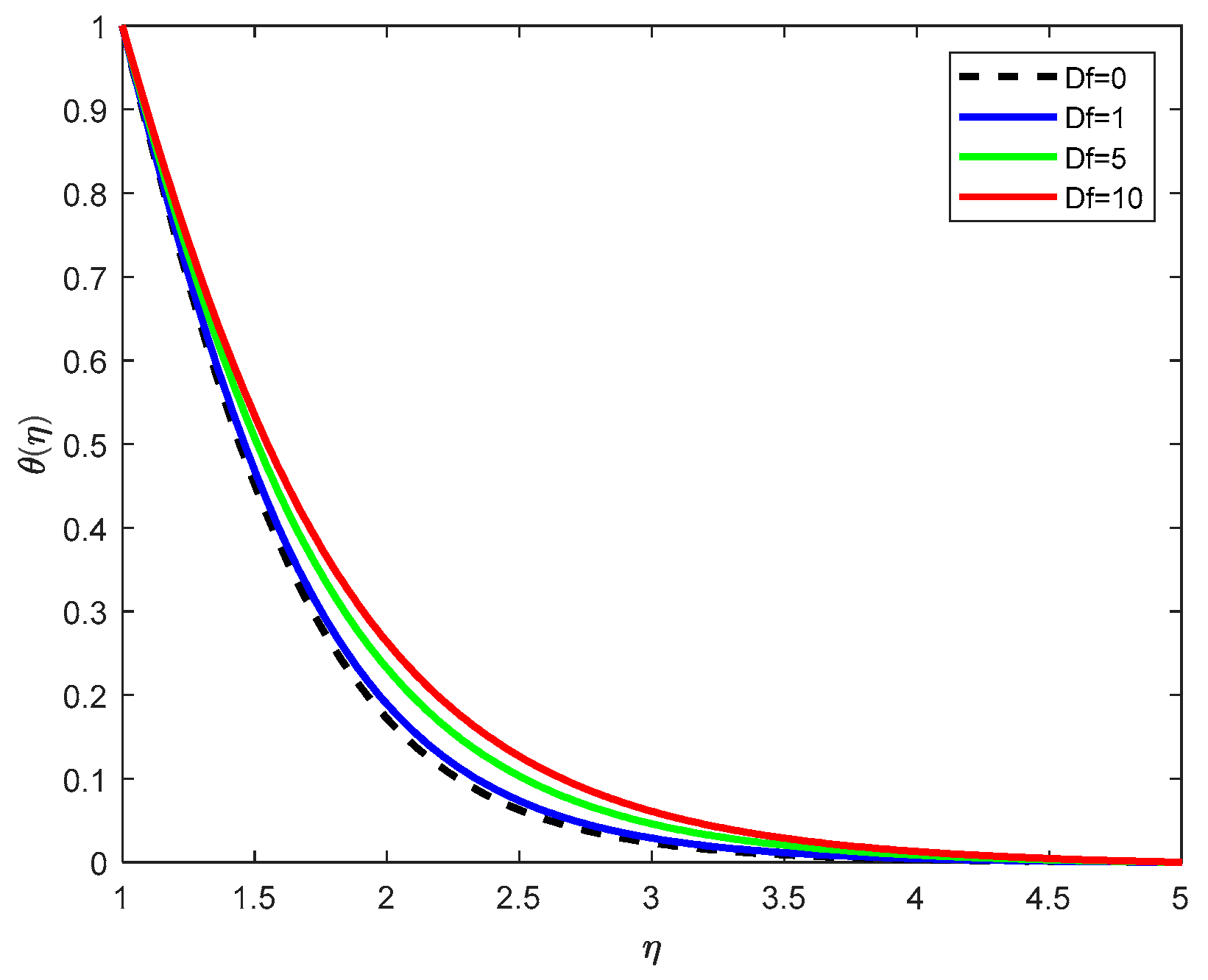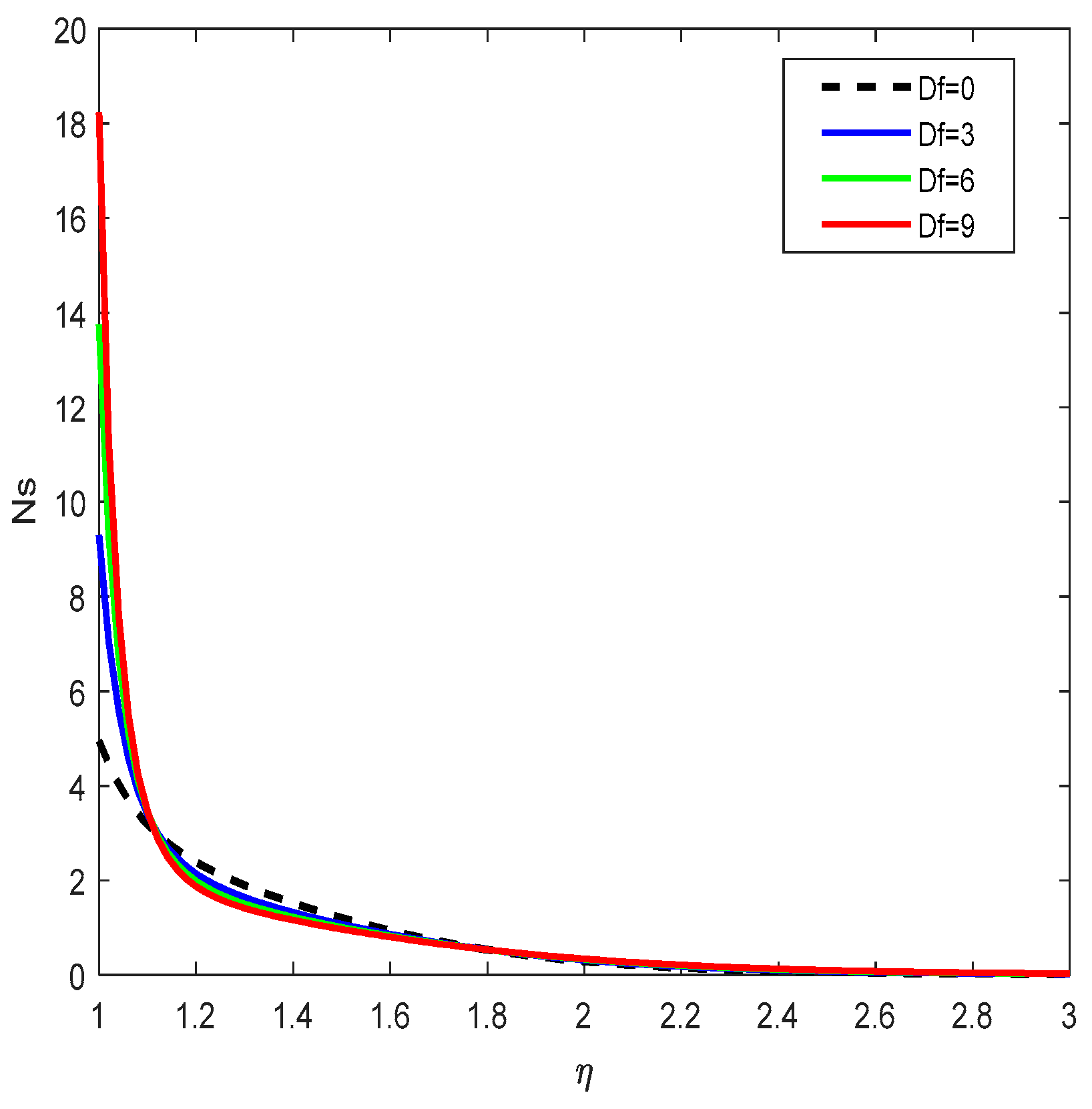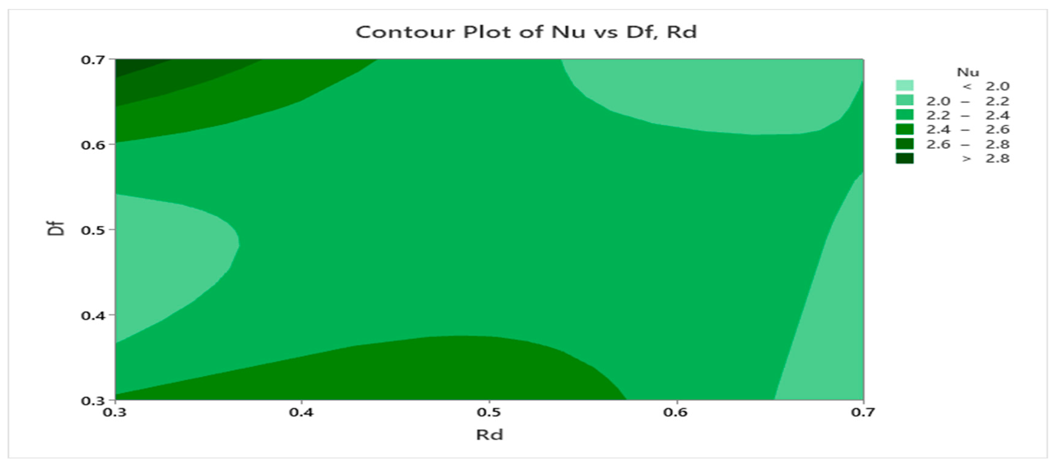 Figure 26, it is evident that both the Darcy–Forchheimer number (Df) and the radiation parameter (Rd) positively contribute to enhancing Nu. The maximum frictional effect is observed when Df reaches its upper limit, while Rd is at a reduced level.