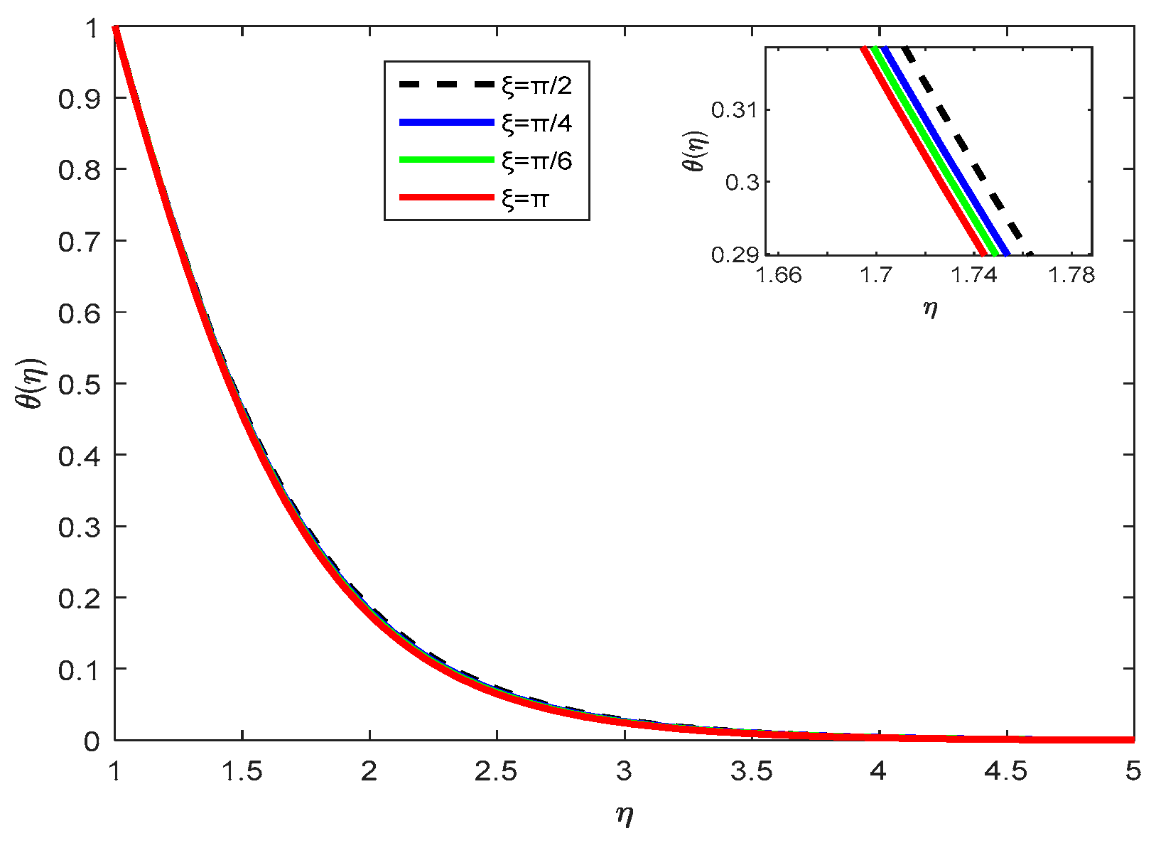Figure 19 as the magnetic field inclination angle ξ decreases from π to π/2, π/4, and π/6, the temperature within the boundary layer decreases. This is due to the weaker damping effect of the magnetic field on the fluid motion at lower inclination angles, which enhances convective heat transfer and cools the system more effectively.