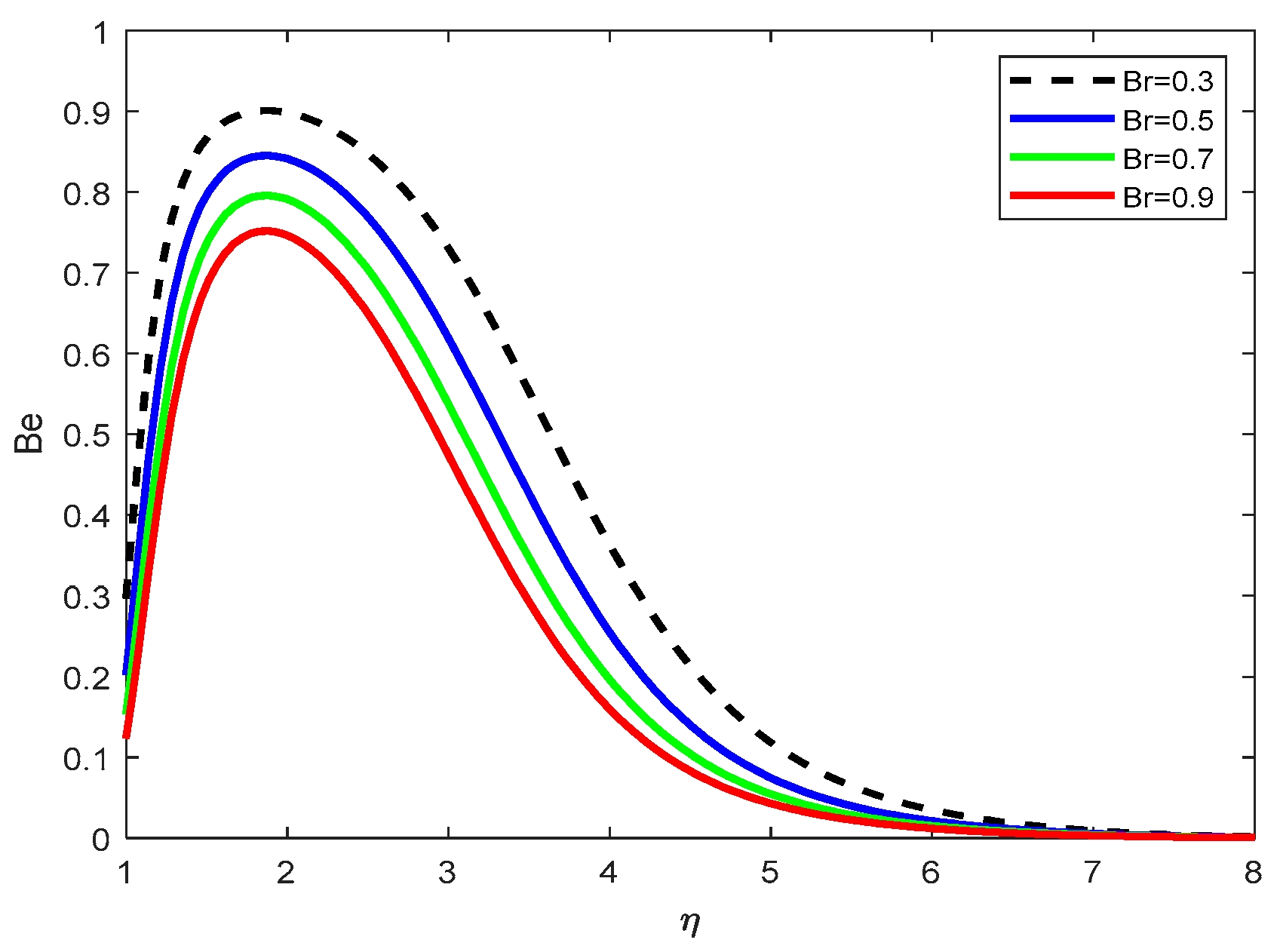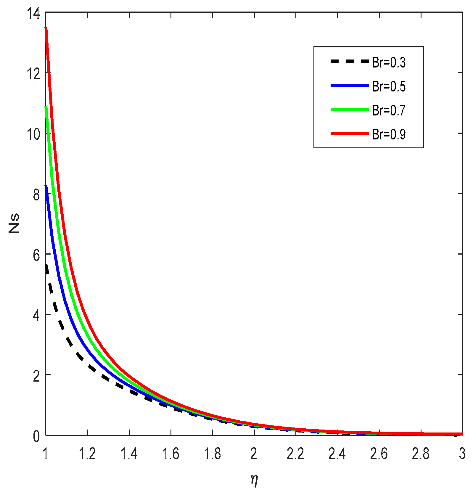 The entropy generation number rises with increasing (Brinkman number), and , indicating intensified thermal and viscous dissipation. The Bejan number decreases with , revealing a shift toward dominance of fluid friction and magnetic reversibility. Conversely, it increases with suggesting that heat transfer irreversibility becomes more prominent under stronger magnetic effects.
