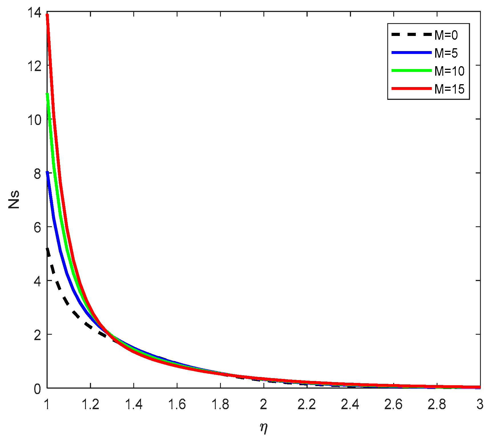Figure 22 demonstrates that the entropy generation number increases with increasing magnetic parameter
