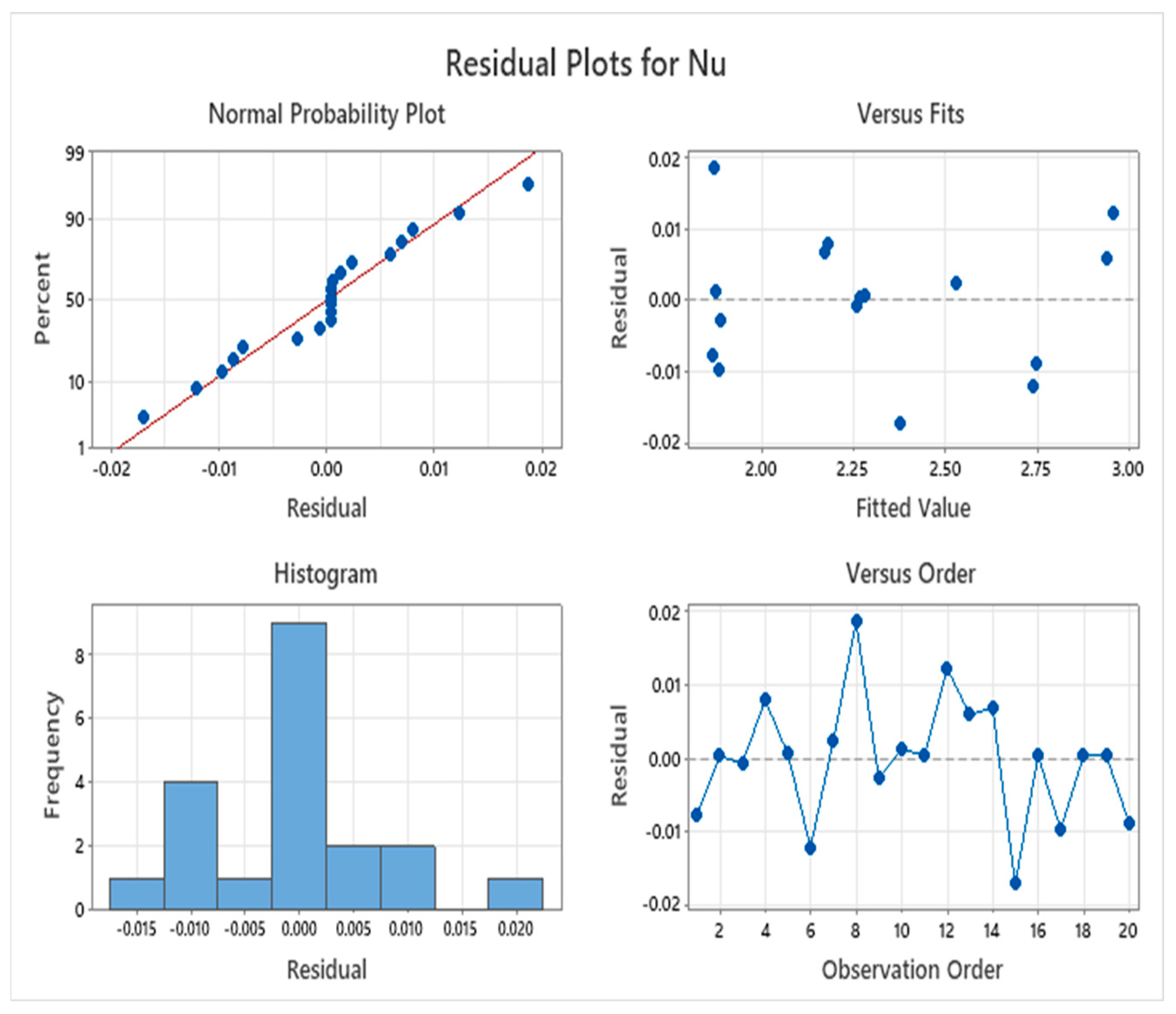 Figure 25 presents the residual plots. Although a few residuals deviate more significantly, the overall trend supports the model’s adequacy and predictive capability. These observations collectively validate the effectiveness of the quadratic model in capturing the underlying response behavior, affirming its appropriateness for engineering applications in this study.