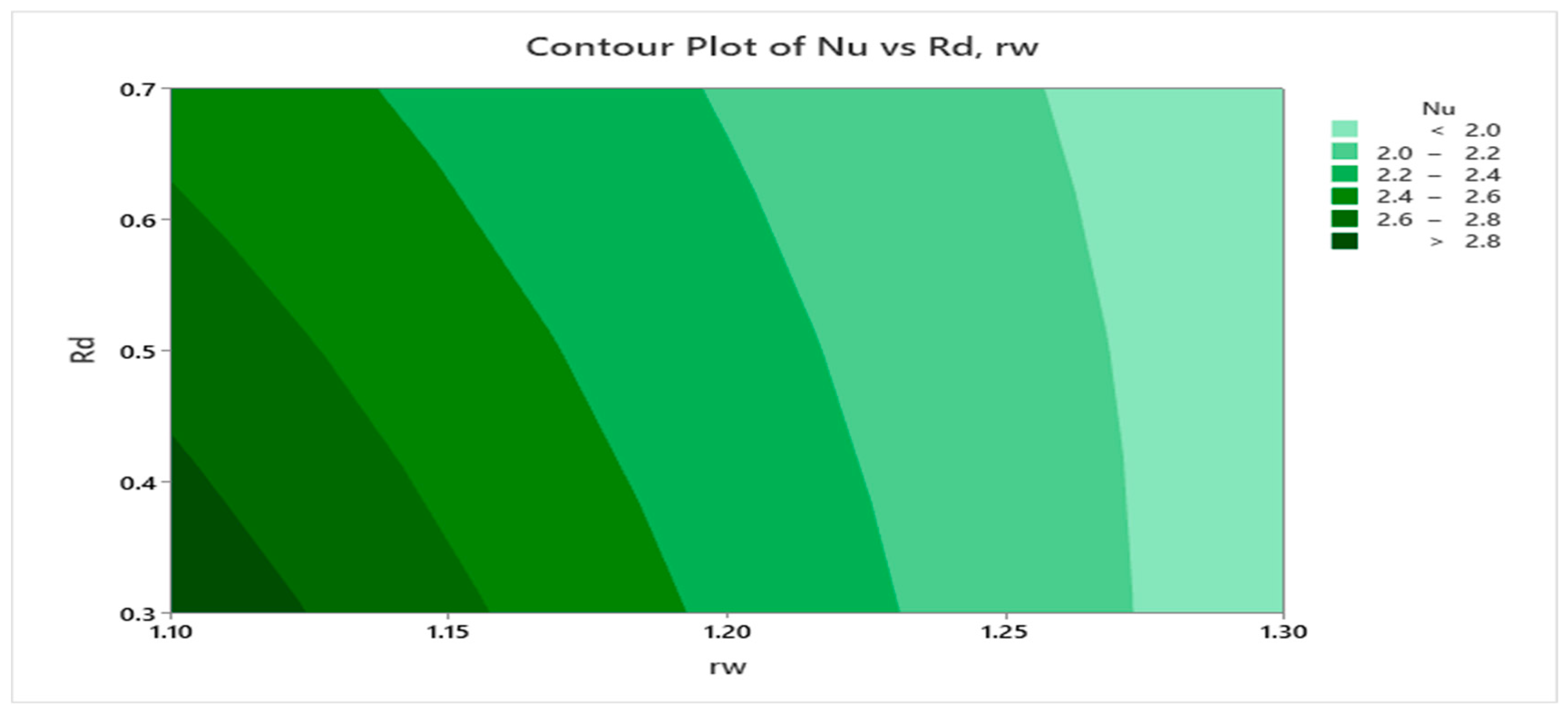 Figure 28, the interaction between Rd and rw is analyzed. The graphical trend suggests that Nu improves as both parameters decrease, highlighting their inverse relationship with the response variable.