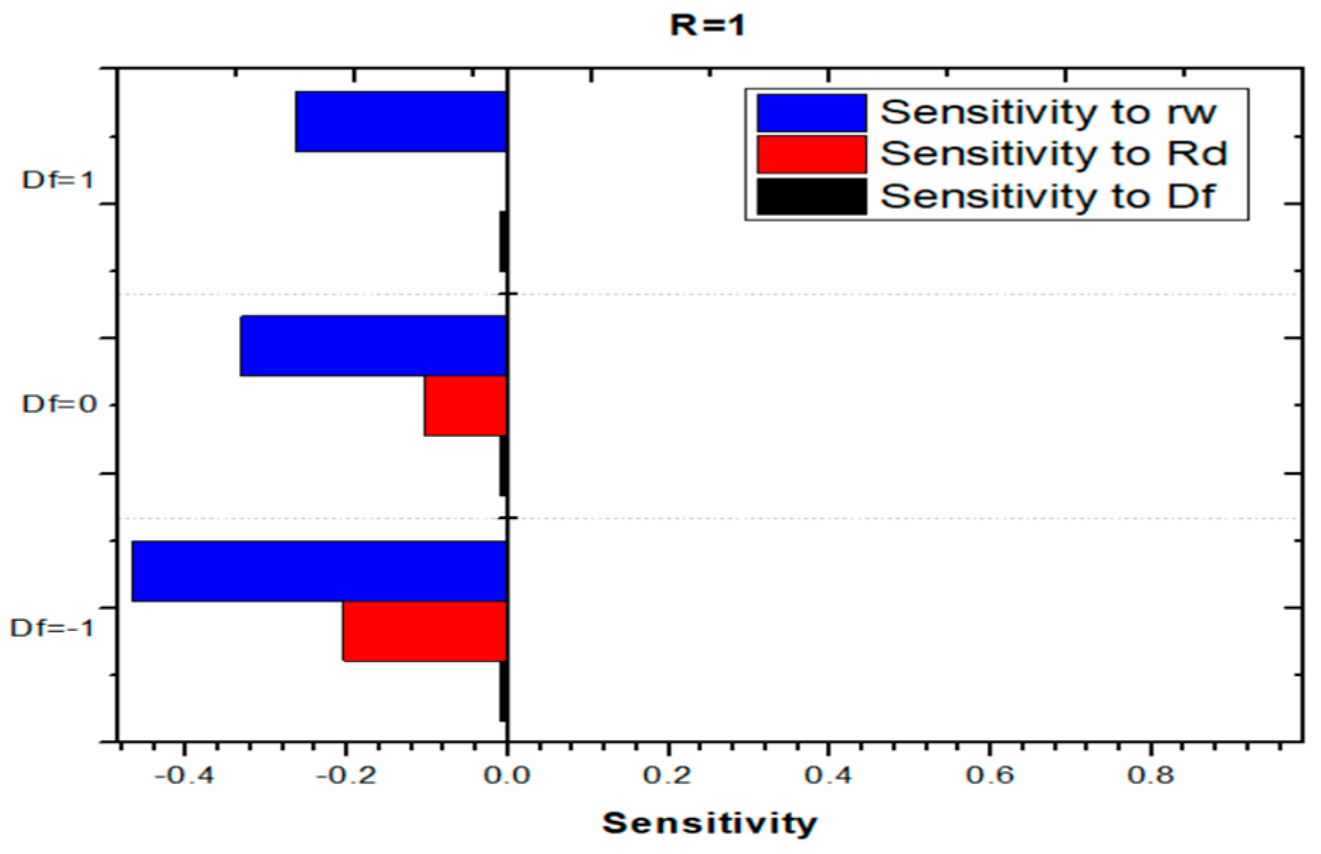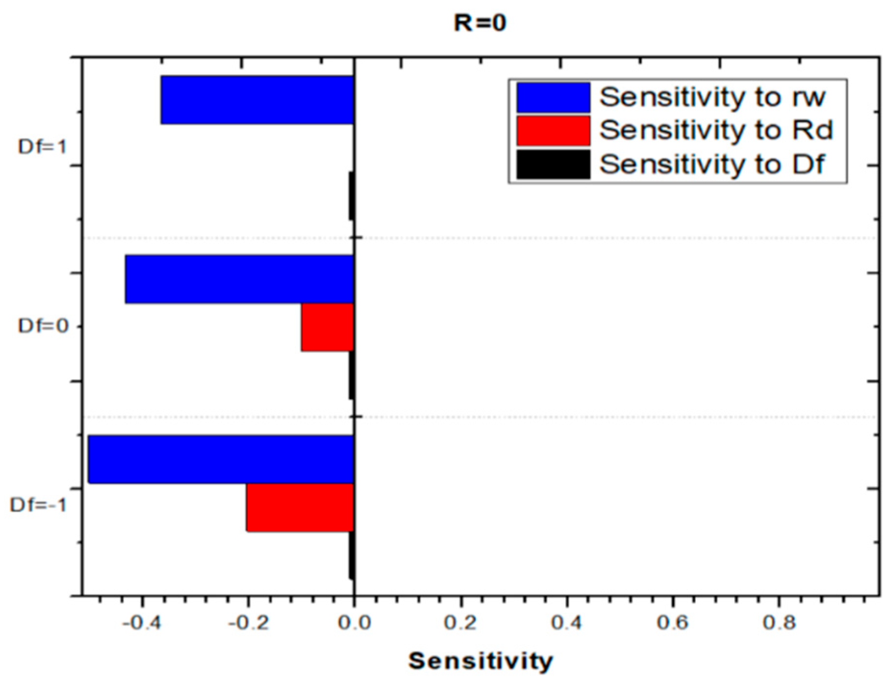 Figure 31 collectively present the sensitivity of the Nusselt number (Nu) with respect to the temperature ratio (rw), radiation parameter (Rd), and Darcy–Forchheimer parameter (Df). The results show that both rw and Rd exhibit consistently negative sensitivities, indicating that an increase in either parameter reduces heat transfer performance. A larger temperature ratio weakens the surface temperature gradient or alters the flow geometry in a manner that diminishes convective efficiency, while higher radiation levels shift the thermal balance toward radiative dominance, thereby suppressing convective transport and thickening the thermal boundary layer. In contrast, the sensitivity of Nu to the Darcy–Forchheimer parameter (Df) remains negligible, suggesting that inertial resistance introduced by the porous medium exerts minimal influence on the heat transfer process under the studied conditions. These findings highlight that temperature ratio and radiation are the critical parameters controlling heat transfer behavior, whereas the effect of porous medium resistance is relatively insignificant.