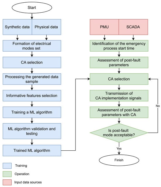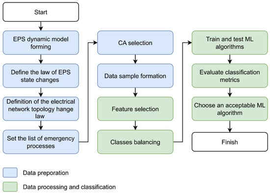 The proposed methodology for selecting CA to ensure TS in the post-fault operation mode of the EPS represents a pipeline structure [31], organizing the end-to-end process of synthesis, data preparation, training, and testing of ML algorithms, as well as the analysis of the classification quality of the CA type. Figure 4 shows the block diagram of the proposed methodology.