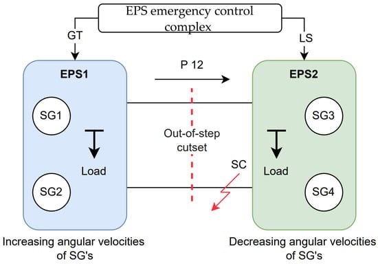 When SC occurs on one of the two parallel transmission lines connecting EPS1 and EPS2, an asynchronous running section occurs, limiting the transmission of active power, shown in Figure 2 by the designation “P 12”. Thus, in EPS1, an excess of active power occurs, leading to an increase in the angular velocities of SGs. In EPS2, a deficit of active power occurs, accompanied by a decrease in the angular velocities of SGs. To maintain EPS TS, GT-type CA is used in EPS1, and LS-type CA is used in EPS2. This method of organizing EPS control enables maintaining TS in post-emergency mode.