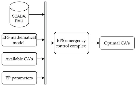 To implement the EPS emergency control complex, information about EPS operation parameter measurements, a mathematical model of the protected EPS, and a list of possible CAs and EP parameters are utilized. Figure 3 shows an example of input and output information for the EPS emergency control complex. Based on the information received from SCADA and PMU, the EP parameters are identified, including the type, location, and parameters of the EP. Using the mathematical model of the protected EPS, the state estimating procedure is performed, and the optimal CAs are selected to ensure EPS TS.