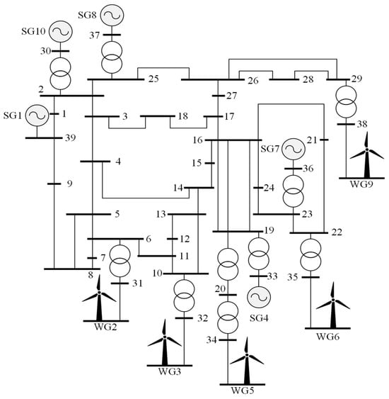 Validation of the proposed control action selection methodology for ensuring dynamic stability was carried out using the mathematical model of the power system IEEE39 [42]. This model consists of 10 SGs, simulated to account for turbine models, automatic voltage regulators, and system stabilizers, as well as 39 nodes and 46 transmission lines. The graphical representation of the modified IEEE39 model is shown in Figure 5. In this model, all SGs are connected to the electrical grid through block step-up transformers. SG1 simulates a connection to an external power system; hence, it is directly connected to node 39, while the remaining SGs represent equivalent power plants. For modeling electromechanical transient processes, selecting CAs, processing data samples, training, and testing machine learning algorithms, the Python 3 development environment was utilized, employing parallel computations on graphics processors. For modeling wind generators (WG), the model and graphs of generated active power from [43] were used. The procedure for forming a data sample is described in detail in studies [6,43], and a similar procedure is used in this study.