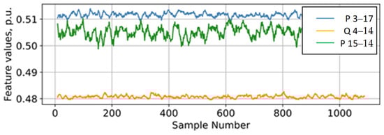 To form the data sample, the procedure of changing the parameters of the electrical mode with subsequent calculation of EP and selection of CA, presented in Figure 2, was used. The following parameters of the electrical mode and calculated EP were used as features of the data sample: active power SG or WG, reactive power SG or WG, modules and phases of voltage in the nodes of the EPS test model, flows of active and reactive powers along the elements of the electrical network, active and reactive conductivity of short-circuit shunts, short-circuit duration, operational state of the elements of the electrical network [46]. The classes in the formed data sample are a complex value that combines the node number, type, and volume of CA. Figure 6 shows an example of measuring the following features in the generated data sample: active power flow along branch 3–17, reactive power flow along branch 4–14, and active power flow along line 15–14.