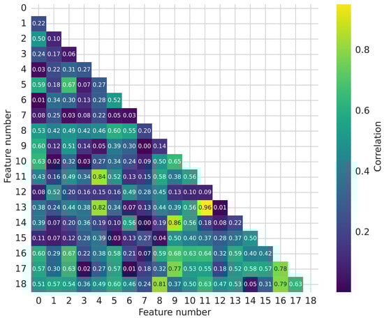 To reduce the dimensionality of the CA volume classification problem being solved, a procedure for selecting the most significant features based on the DT algorithm [47] is used. The Gini coefficient is used as a feature significance metric. Figure 7 shows the correlation matrix of the selected informative features with the most tremendous significance for the CA volume classification problem.