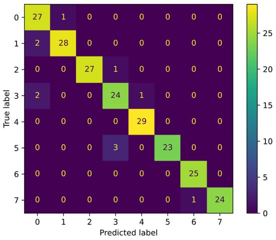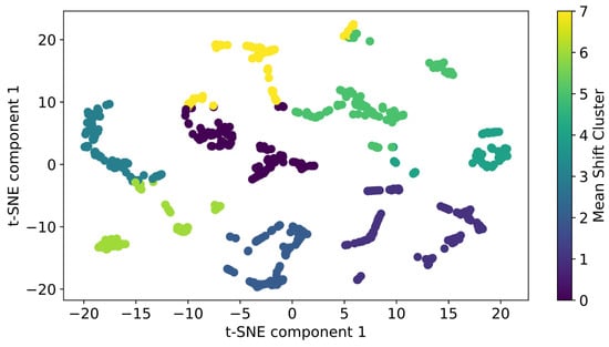 A necessary condition for applying the classification algorithm is the presence of data clustering, which makes it possible to construct a dividing surface. The most visual method of data cluster analysis is the analysis of the results of data dimensionality reduction algorithms: the principal component analysis (PCA), t-distributed Stochastic Neighbor Embedding (t-SNE) [49], multidimensional scaling, isometric mapping, etc. Figure 8 shows the results of clustering the generated data sample using the Mean shift [50] algorithm applied to the two-dimensional space of the first two t-SNE components. Since the t-SNE algorithm does not provide a physical interpretation of the coordinate axes, the axes in Figure 6 do not have physical dimensions. As a result of applying the Mean shift algorithm in the space of the first two t-SNE components, 8 clusters were identified, for describing the clustering quality of which the standard metrics given in Table 5 were used [51].